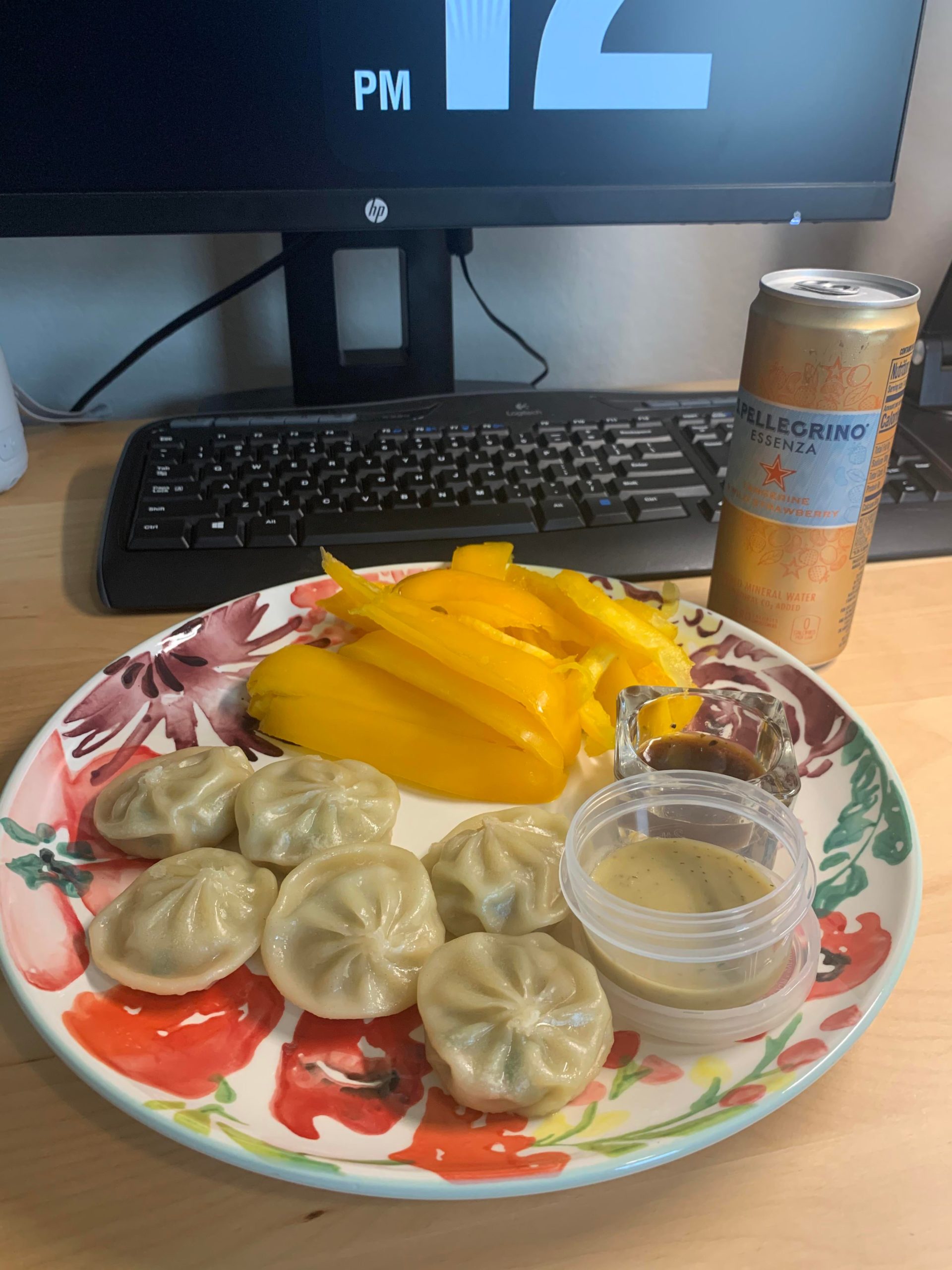 My favorite 5-minute low calorie lunch!! ~340 calories for 6 dumplings (Bibigo from Costco, 250 cal) with TJ’s gyoza dipping sauce and sliced bell pepper with chickpea tzatziki dip + a mineral water 😌✌️✨