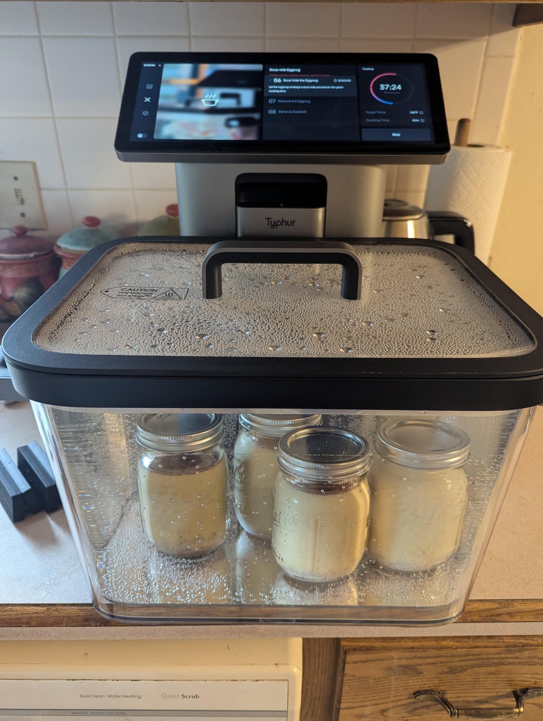 The eggnog sat in the water for one hour and this is where I had a bit of a problem of my own doing… My son was at an event and I was thinking he needed to be picked up two hours later than he actually needed to be picked up. Unfortunately, I had to rush out and knew I wasn’t going to make it back in time before the timer stopped. This is where I really fell in love with the mobile app. I had my phone on the mount in my car and I was able to watch the sous vide timer as I drove. When it finished I was able to have my wife remove them so they didn’t stay in any longer than they needed to. I know for most meat it wouldn’t have been an issue, but this is the first time I’ve ever tried to sous vide a milk and egg combination so I wasn’t sure what the ramifications would be if I left it in. Anyhow, I think she had a much less exciting time trying to get the jars out of the water than I did putting them in (which was entirely due to my lack of proper tools and had nothing to do with the Typhur Sous Vide Station). She put them in the refrigerator, and we let them chill for the afternoon.