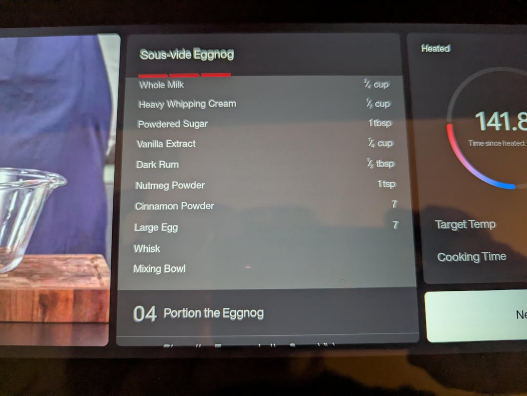 One of the really cool features of this sous vide station is the 12 inch, Wi-Fi capable touch screen. It allows you to search for different foods and then gives you step-by-step instructions on how to make it. For the maiden voyage I wanted to find something that I have never made, but something that was fairly simple. I knew that we as a family were going to be watching a Christmas movie that evening, and when I saw there was an eggnog recipe, I knew that was the one! The ingredients were simple to obtain (most of which I already had on hand):