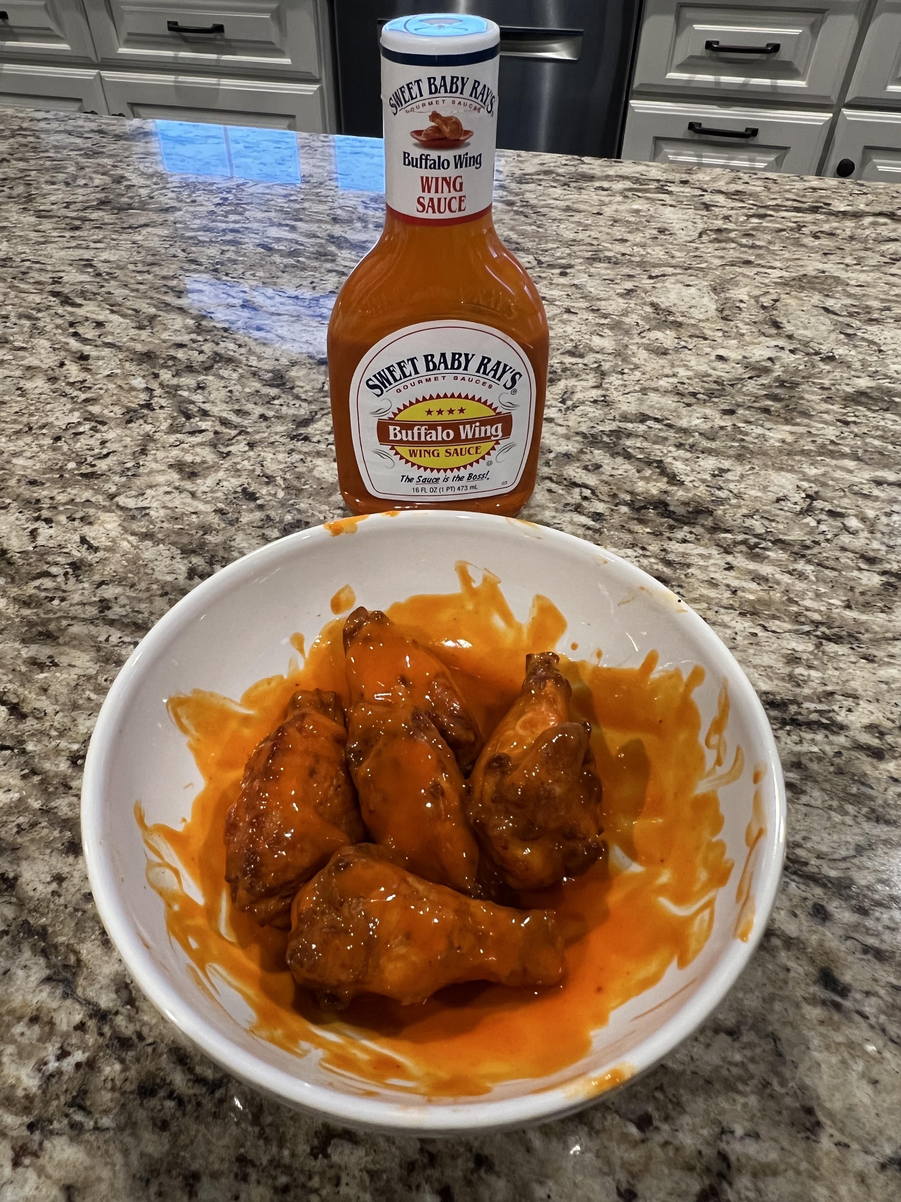 Foster Farms Crispy take out wings from Costco with Sweet Baby Ray’s…its a solid option for at home wings. The sauce is buttery and tangy with a hint of garlic. It’s def top tier in regards to wing sauces imo.