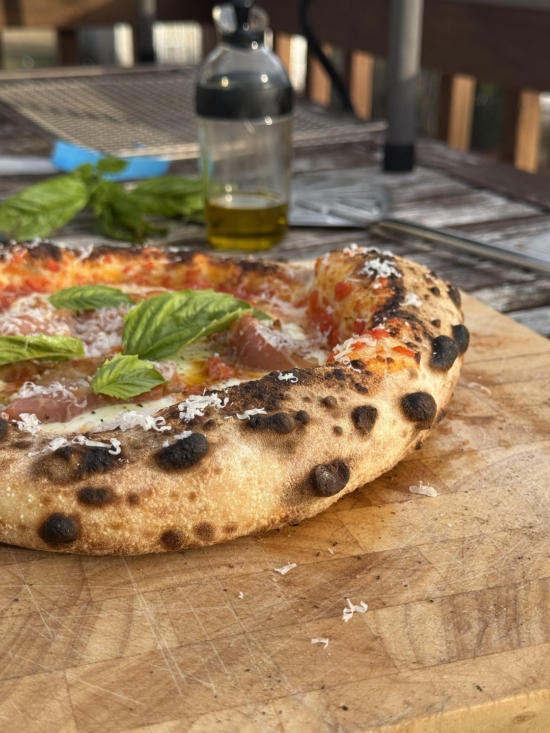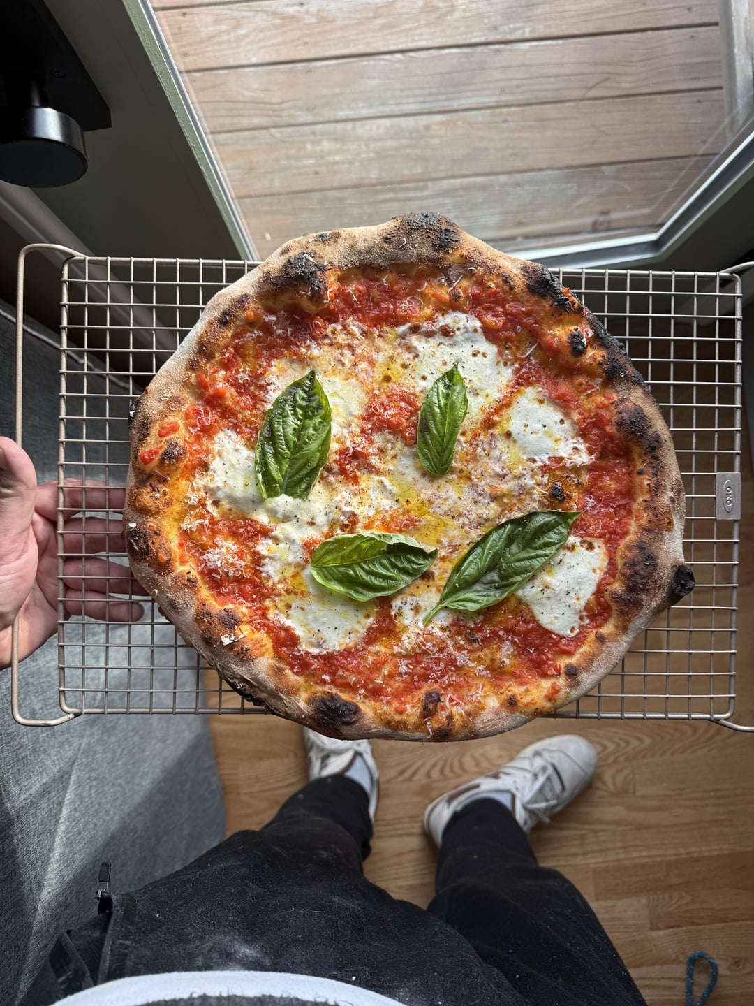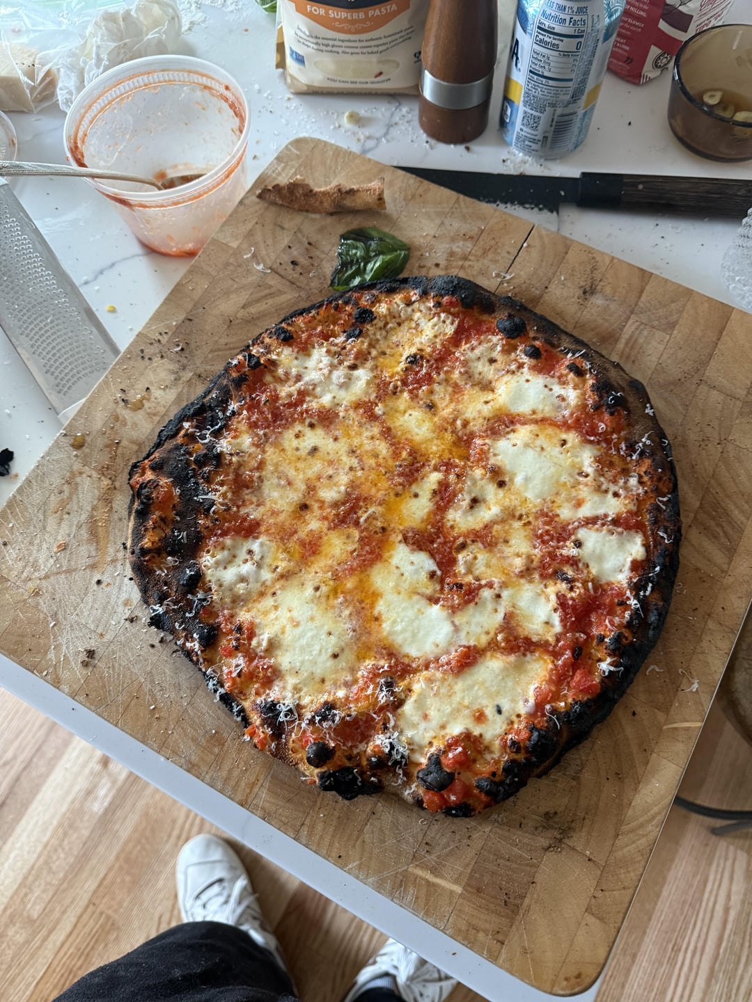 Pie #4 instead of allowing the crust to rise I stretched and flatted to almost roman style thin and fired it a bit longer for more char and crisp.