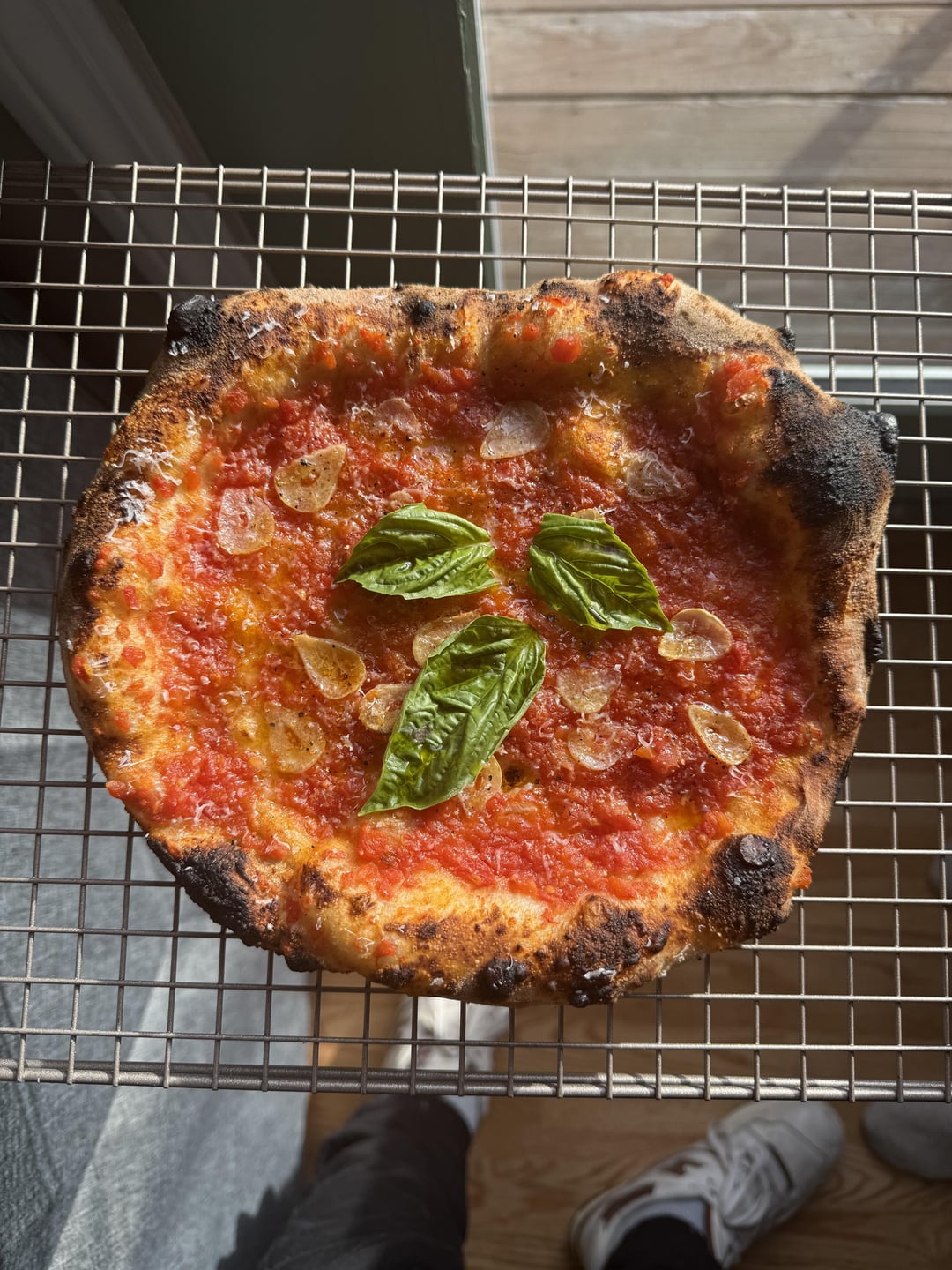 Pie #1 was a simple marinara; sauce, sliced garlic, and oil, after pulling I grated parm reggiano, cracked pepper and a few basil leaves.
