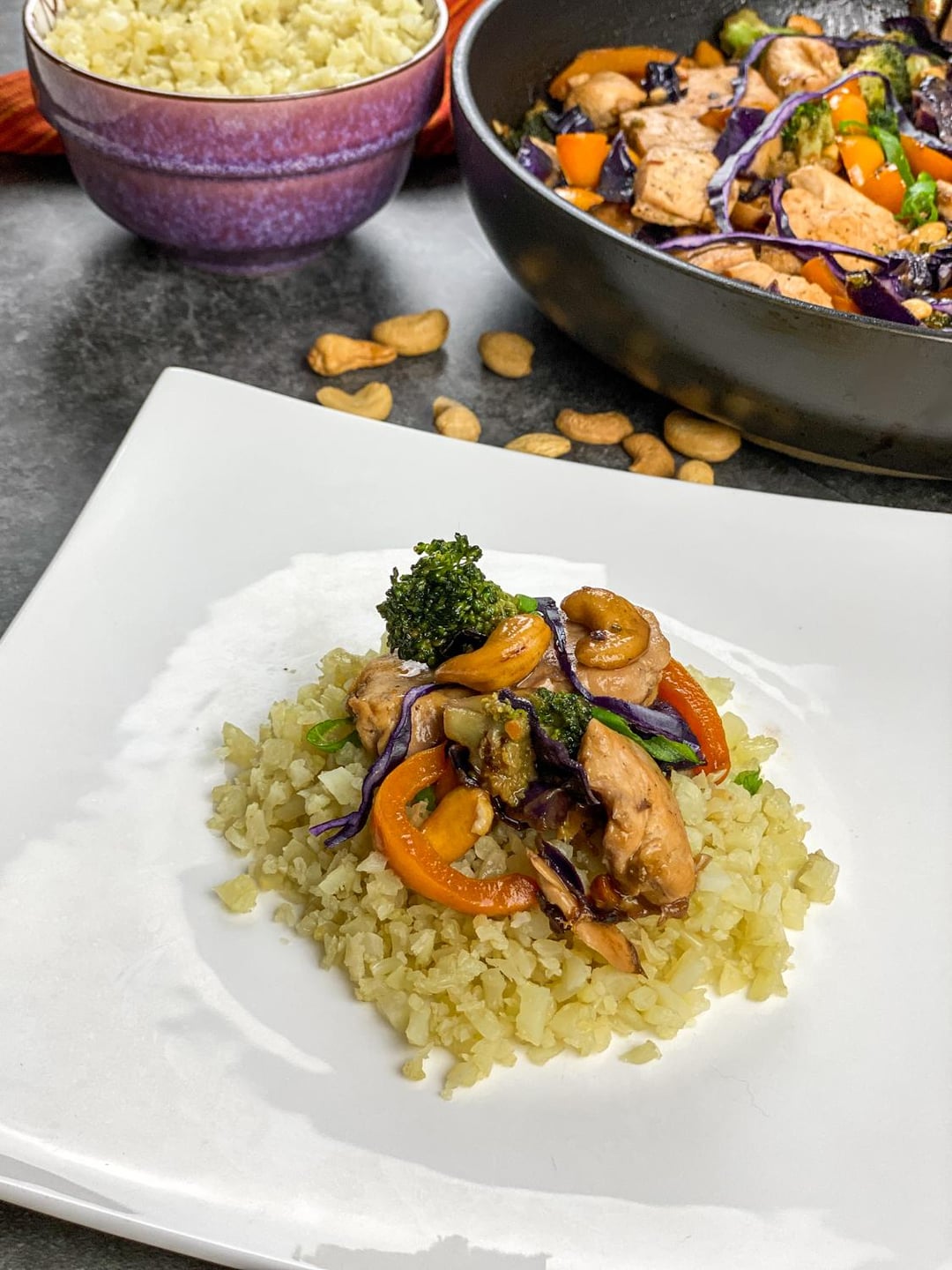 6. Remove from heat and taste and adjust seasonings, as desired. Serve immediately with steamed cauliflower rice. Enjoy!