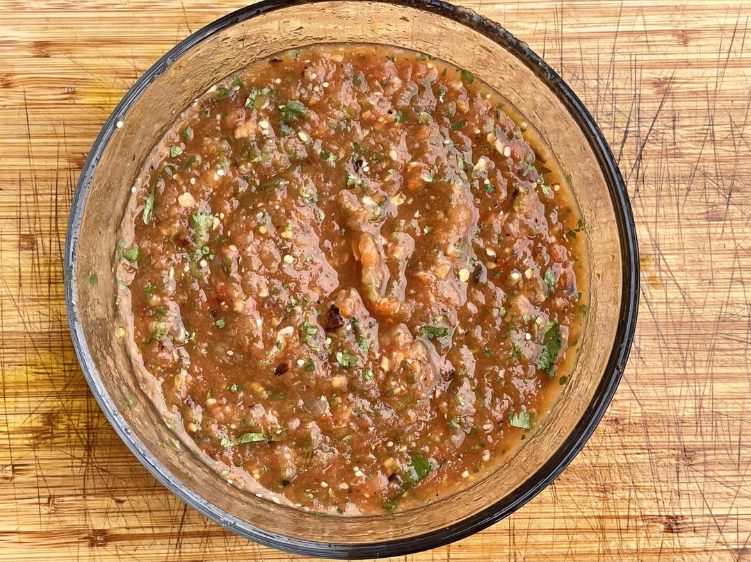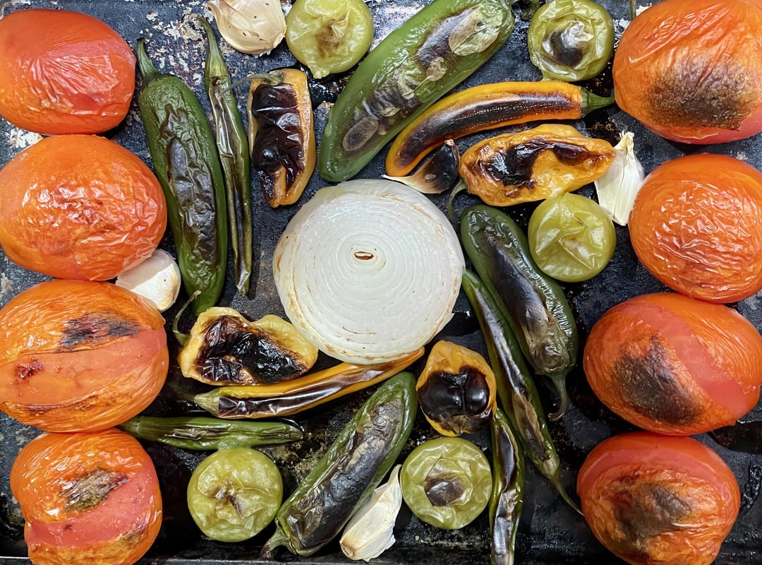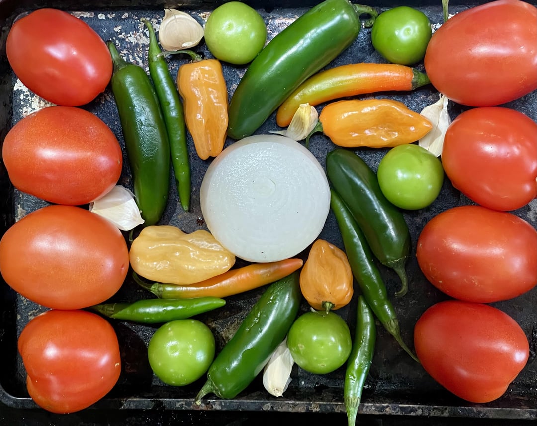 This one is well balanced with 8 Roma tomatoes 5 tomatillos 5 Jalepeno 5 Serrano chilis 1 white onion 4 habanero peppers 4 cloves garlic 1/2 tsp cumin Salt and pepper to taste 1 handful cilantro 1 lime squeezed I roasted 2/3 of onion and used 1/3 raw I blended 1/2 Cilenteo and mixed 1/2 in By hand I roasted in over 10 min and flipped everything and roasted another 8 min Blended on very slow pulse