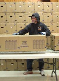 Mike Oxx bushes boxes down the line to be loaded on Friday Dec. 13 2024.