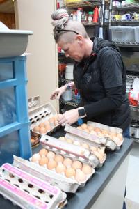 Jackie Anderson the force behind the Elks Christmas Box project inspects eggs before they are boxed and sent out to families on December Fri. 13, 2024.