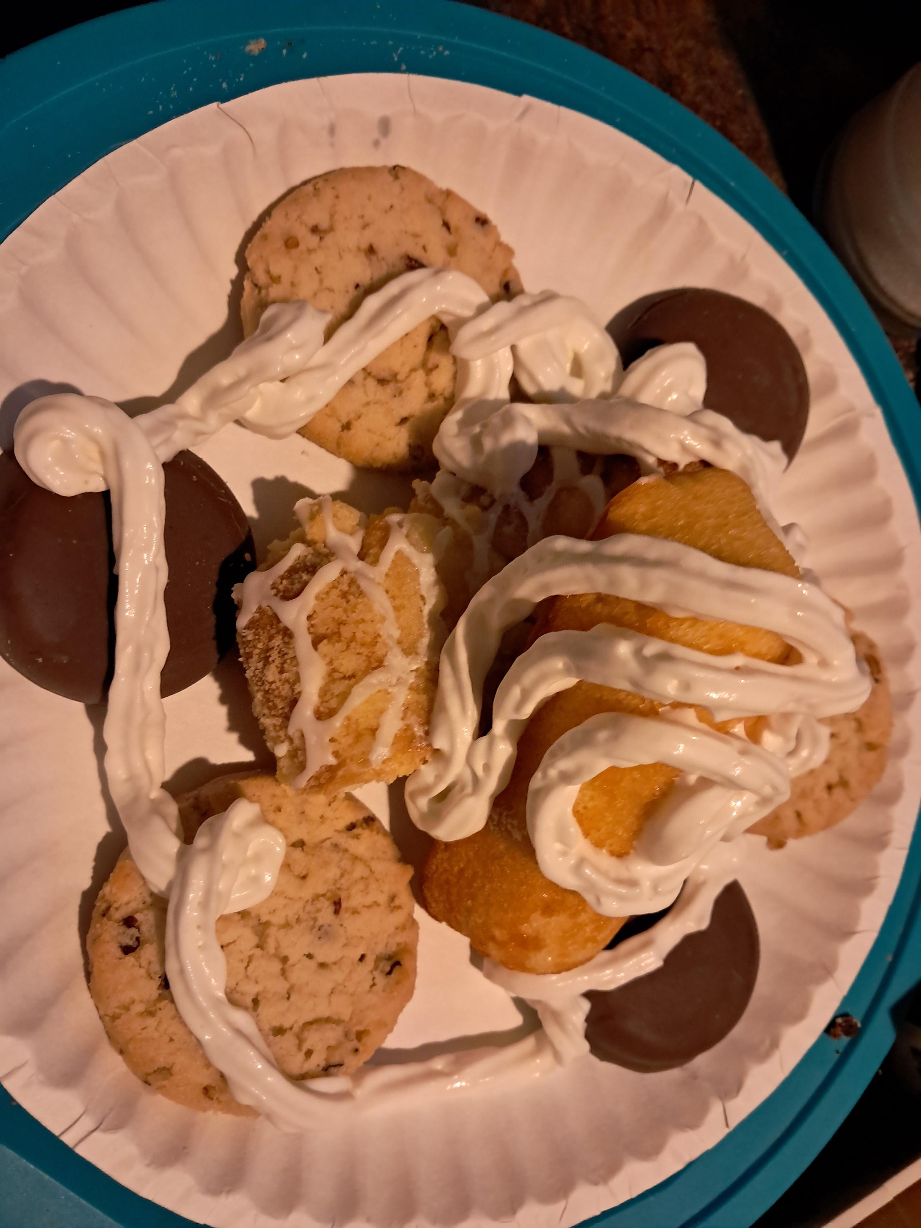 Sampler Platter with Peanut Butter Chocolate Cookies, Pecan Sandies, a cream cheese Danish & a Twinkie!