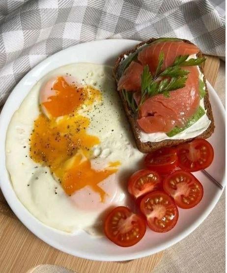 Eggs, smoked salmon on toast, and cherry tomatoes