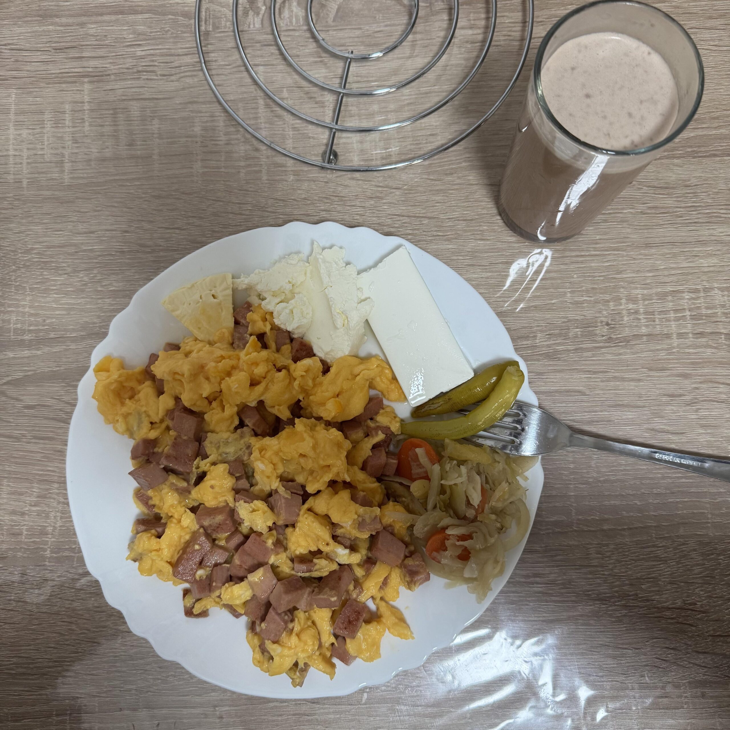 6 eggs, a little bit of 3 different cheese, some high protein chicken salami, cabbage with a little carrots, pickle and spicy pepperonis and a protein shake with water. Very cheap breakfest/lunch and gets the nutrients in.
