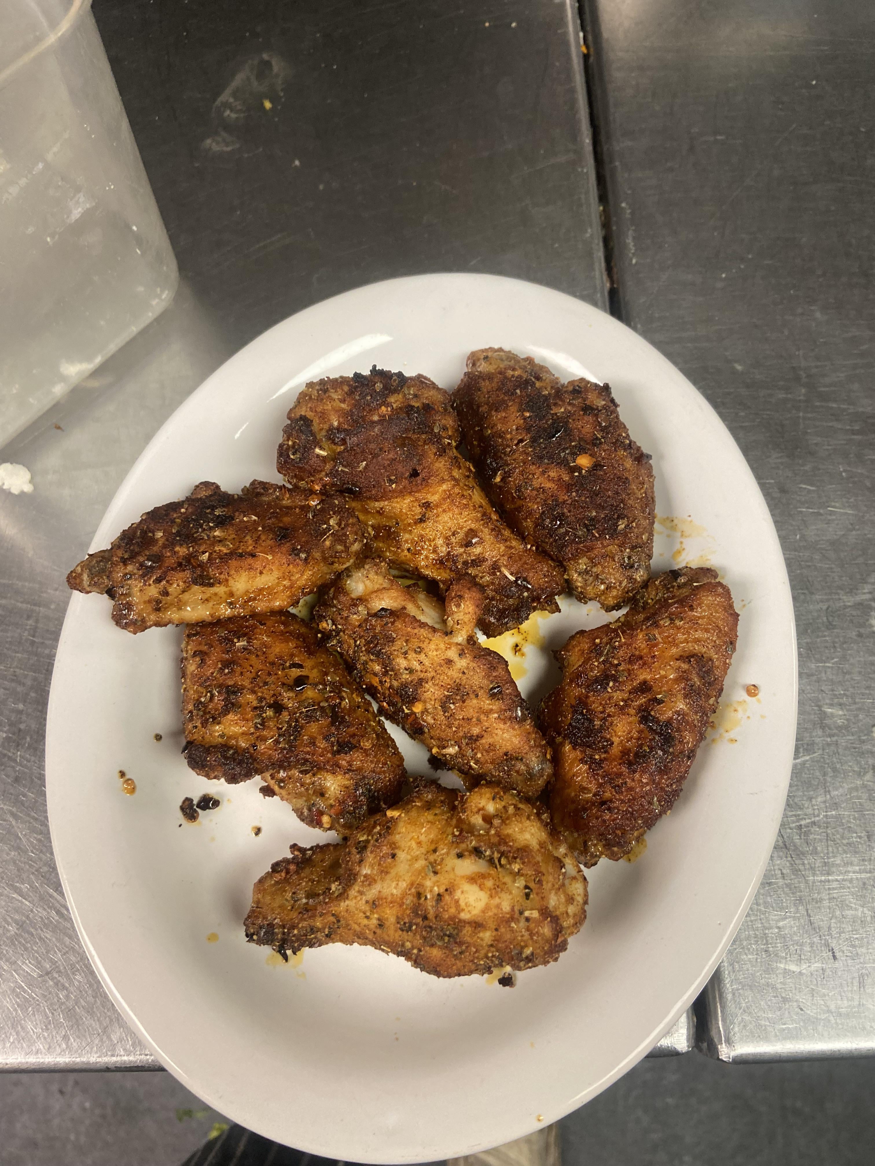 so they’re precooked, frozen wings. i lathered them in oil and just used some of the dry spices we have on hand. flipped several times and cooked for about fifteen minutes on a baking sheet in a 650 degree pizza oven. one word: slamming.
