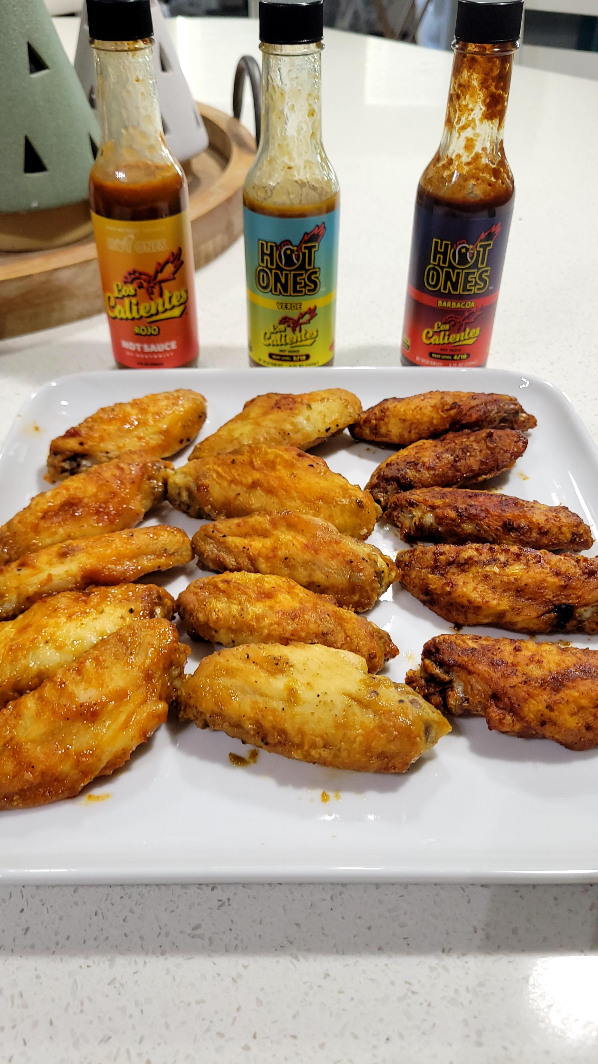 Really liked the flavor of all 3! The Verde and Rojo are both mediums and have a good spice level, the Barbacoa is a bit milder, basically a spicy BBQ. Rojo was my favorite of the 3. Wings were made in an air fryer.