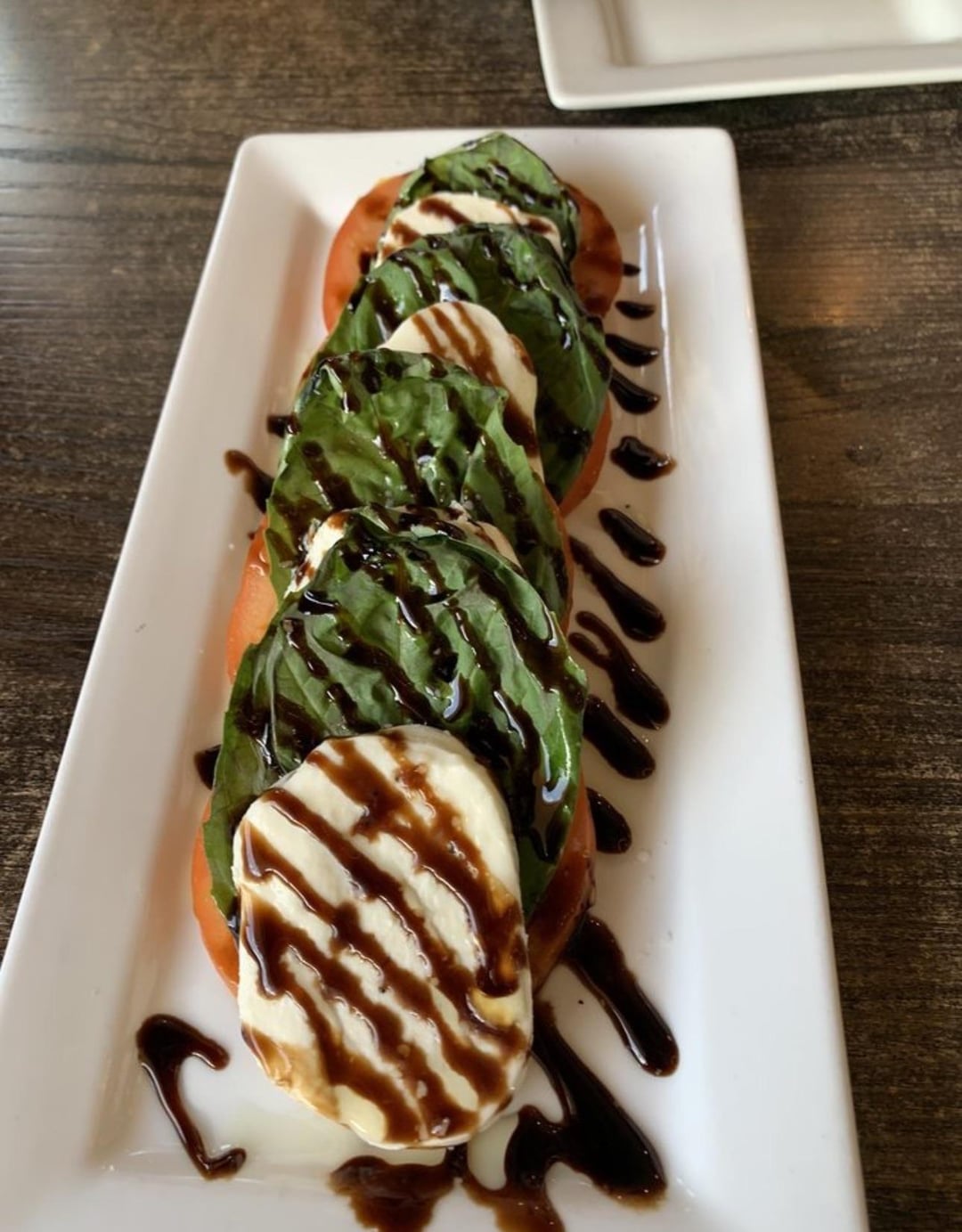 The second appetizer is a caprese with fresh mozzarella, tomatoes, fresh basil, drizzled with balsamic vinegar reduction.