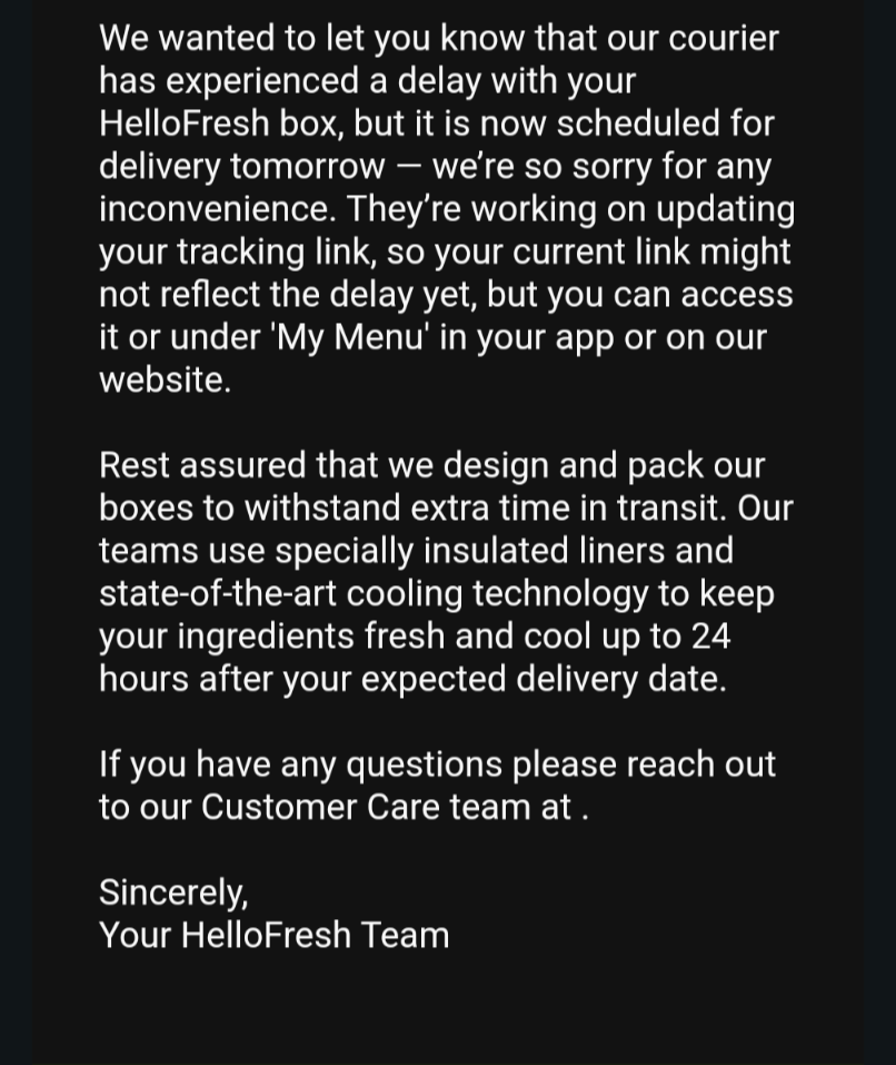 I got my usual text on Sunday at 10 am that my box would be delivered Monday, our usual day, but never got follow up text with a time window. At 8pm last night (Monday) I received this email. It is now 5pm Tuesday and I've not gotten any updates or and updated tracking link. I messaged Veho and they said they would try to update me soon with the delivery window.