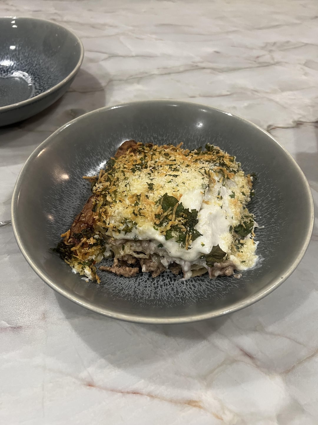 Beef swapped out for pork and mushrooms cooked in butter and a glug of white wine, layers of Parma ham and a panko, white sauce made with marscapone and nutmeg, layers of taleggio in between. Panko, parmesan and parsley crust. La Bosh