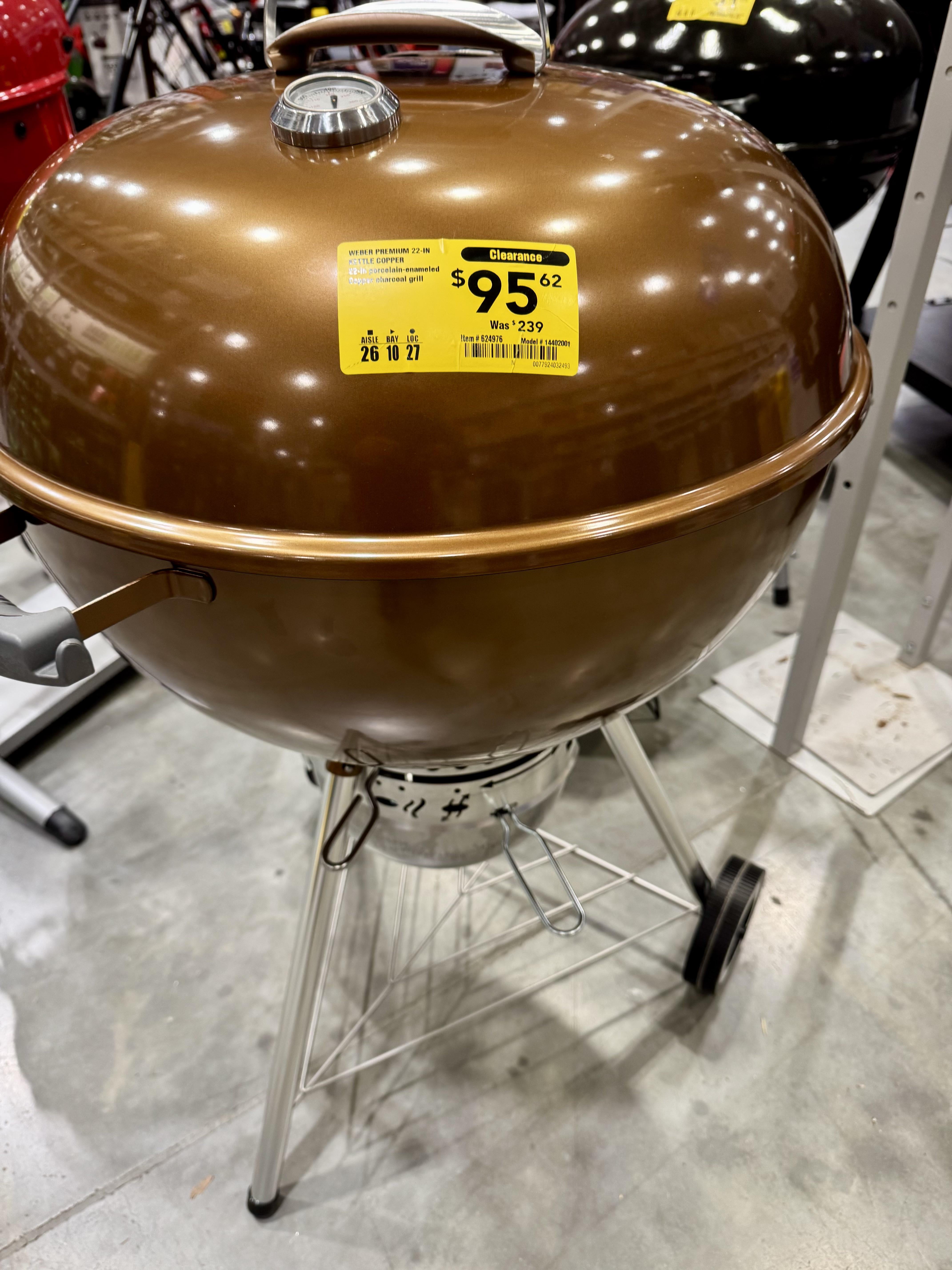 Lowe’s. 60% off for clearance. 22” Copper. by North-Call8637 10 Comments ChugsMaJugs 10 months ago I’d buy it and I already have one SUCKMYPAULZ69 10 months ago Why is it not in your car. singingboysbrewing 10 months ago Great deal Dukegnar43 10 months ago Killer grill. Here’s what I did on mine today.https://preview.redd.it/t9ppkutrui7e1.jpeg?width=3024&format=pjpg&auto=webp&s=133d9756206c0cf5d28be91efa808b93d387c97bTwo bacon wrapped chicken breasts stuffed with jalapeño and cheddar and a ribeye. I love my copper kettle. white94rx 10 months ago F’ing buy it now or tell me where so I can come get it!I’ll be going to Lowe’s tomorrow to look for the same deal. SomeGuy2088 10 months ago https://preview.redd.it/src2lz1wyi7e1.jpeg?width=3024&format=pjpg&auto=webp&s=3101c9650c8bcc8e86323248c6159b43eef98eb3Got mine for $127 total the other day dontsithurslf 10 months ago Why can’t I find these deals at my local HD? Colinski282 10 months ago I’m about to scan and print that sticker and slap it on the floor model lol Reddit_and_forgeddit 10 months ago I have this exact grill. It’s all beat up but I still love to cook steaks on it. BeamTeam 10 months ago How much for the black one in the background?Write A CommentYou must be logged in to post a comment.