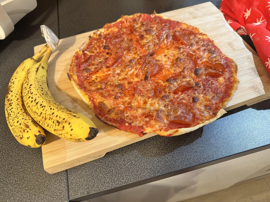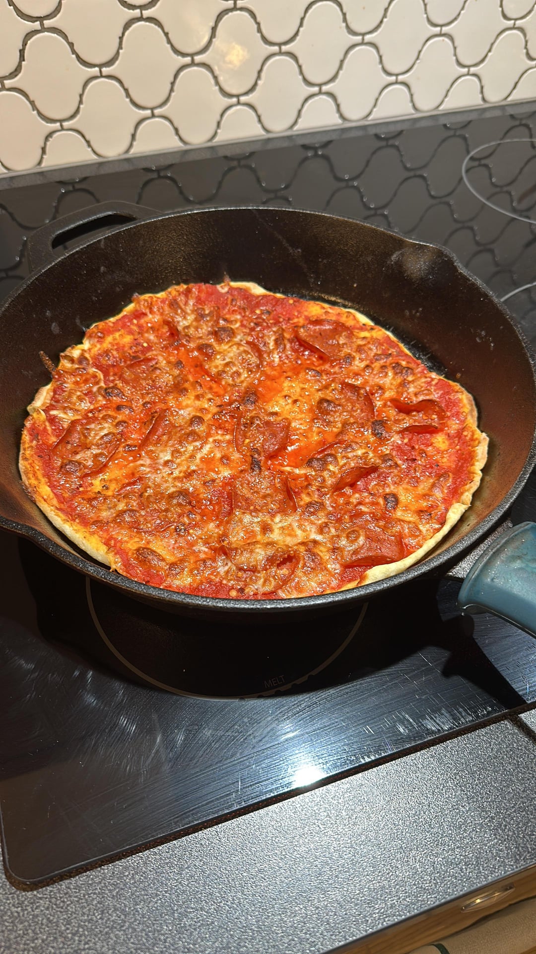 This is my twice (maybe thrice) weekly treat because pizza is my favorite food. Thin crust pepperoni pizza cooked in the cast iron skillet. Ingredients and recipe for the crust included in the post. I log /scan & weigh all my ingredients so calorie reflections are accurate for the items I used.