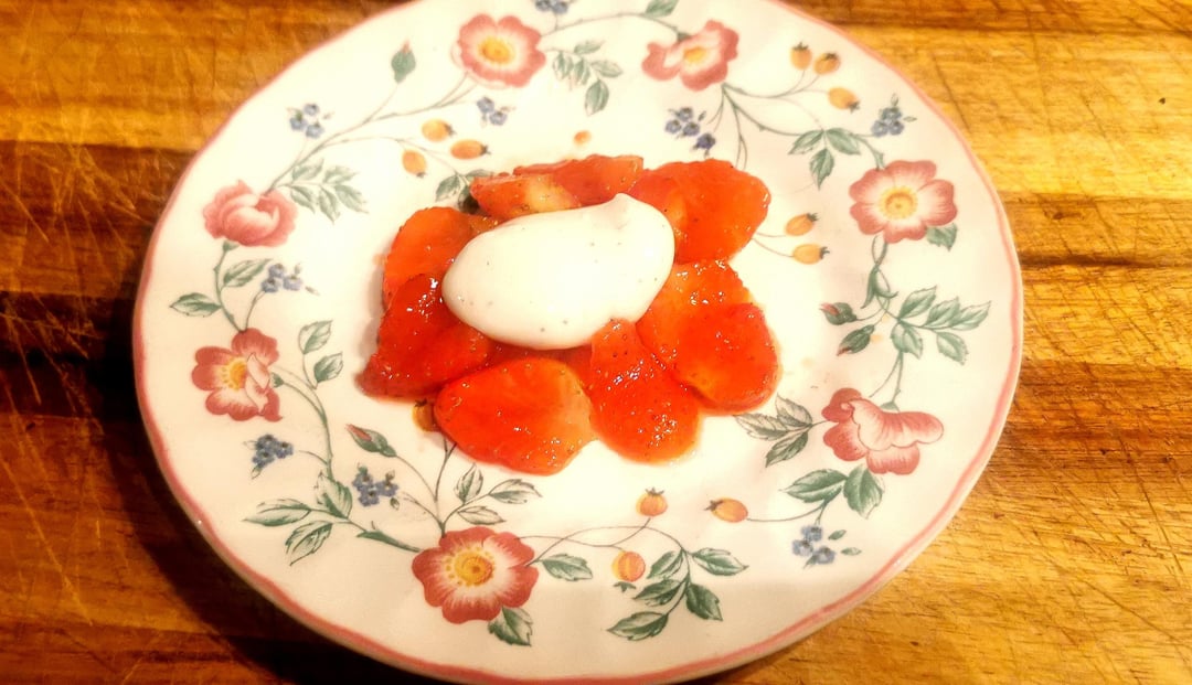 Working on reverse spherification dessert (sodium alginate bath process) – Greek Yoghurt, honey, black pepper and tahini spheres with lemon and sugar strawberries on a chocolate chip sponge