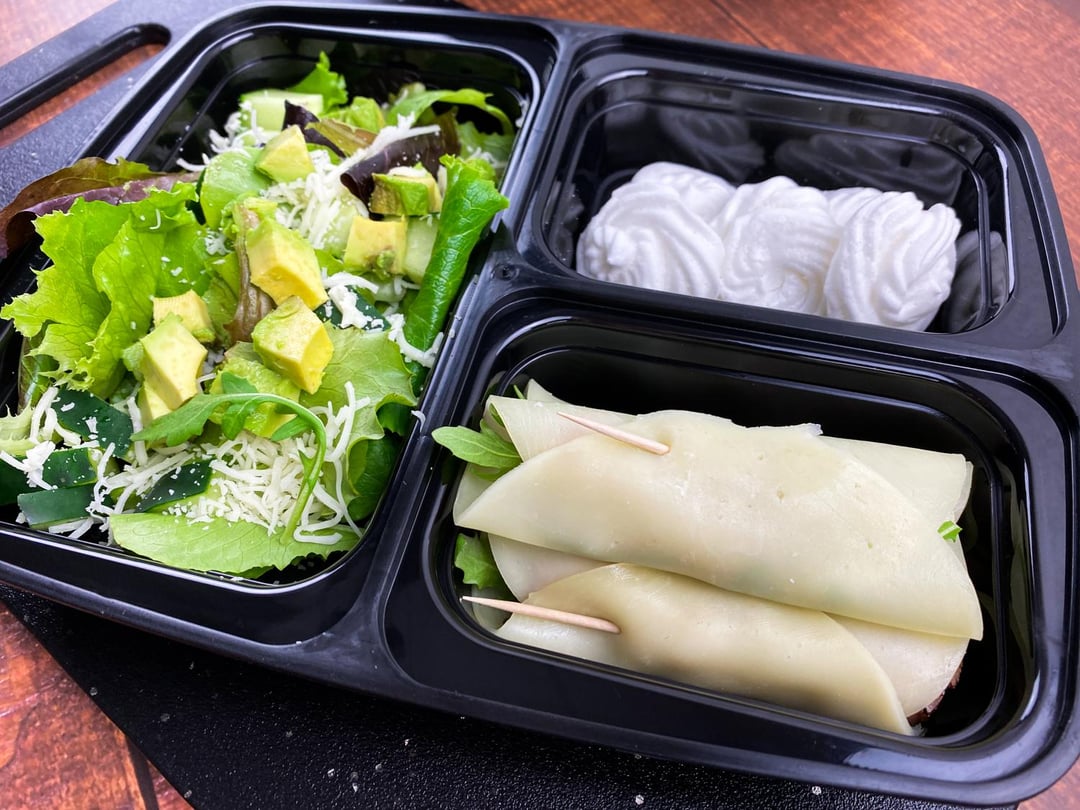 This super easy lunch idea can be paired with any low carb sides of your choice. As shown, this light, but satisfying, lunch includes three rollups, one cup mixed salad greens with one-quarter cup each chopped cucumber and avocado, and five almond meringue cookies. Dressing is a simple drizzle of a little olive oil and balsamic vinegar.