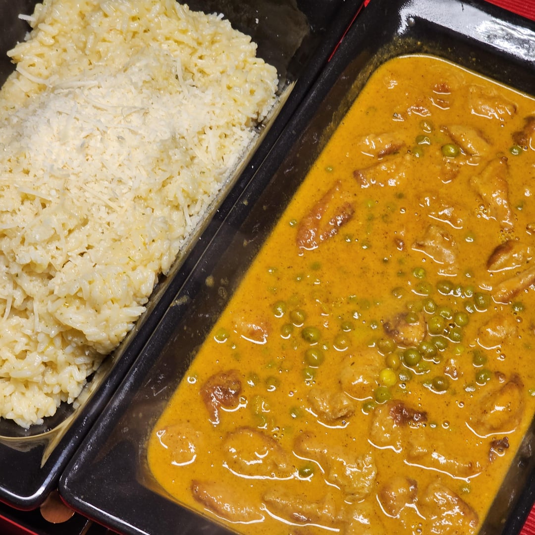 Meatballs made from Kalbsbrät (finely ground veal meat paste) served in a creamy curry sauce with white wine, honey, peas and freshly pressed orange juice, accompanied by buttered rice