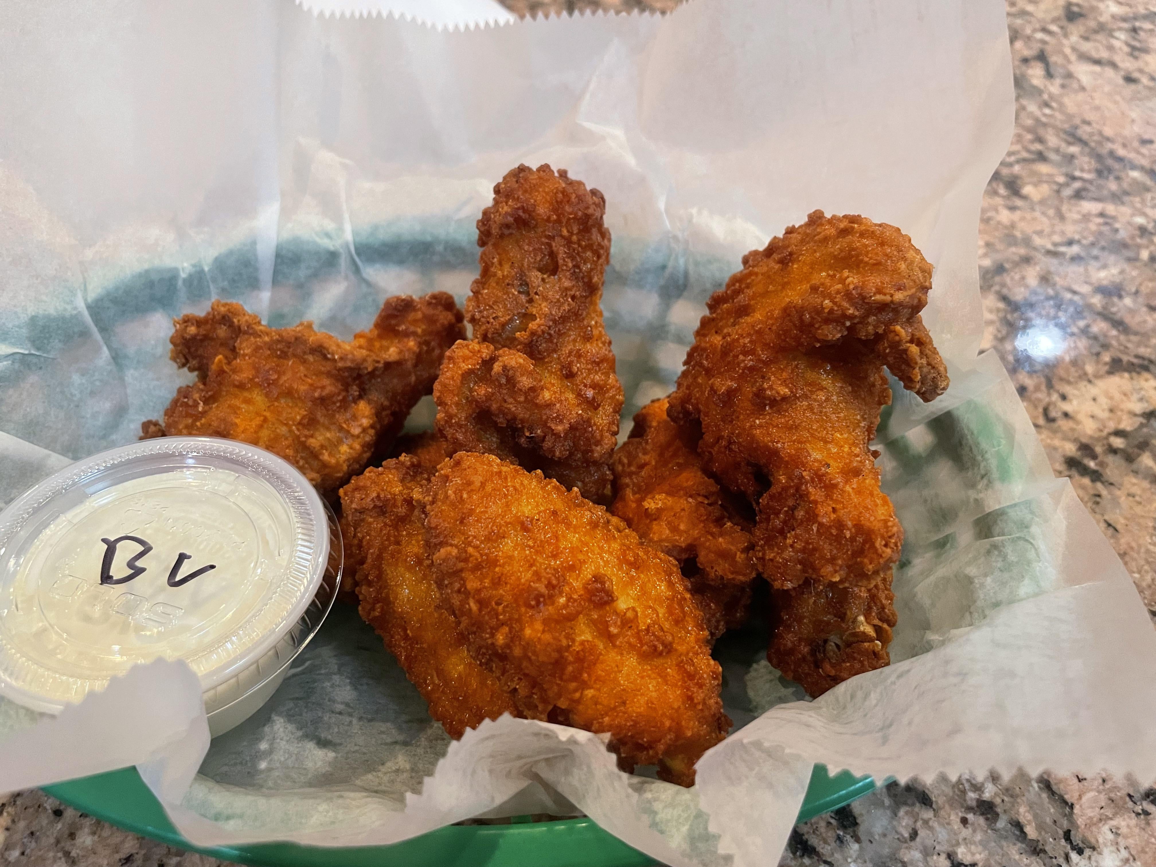 These are clearly freezer to fryer to plate. Nothing fancy but not bad. A bit salty. I won’t order them again but I am damned sure finishing them. Still head and shoulders above the crap at Buffalo Wild Wings, where they are scrawny and overcooked.