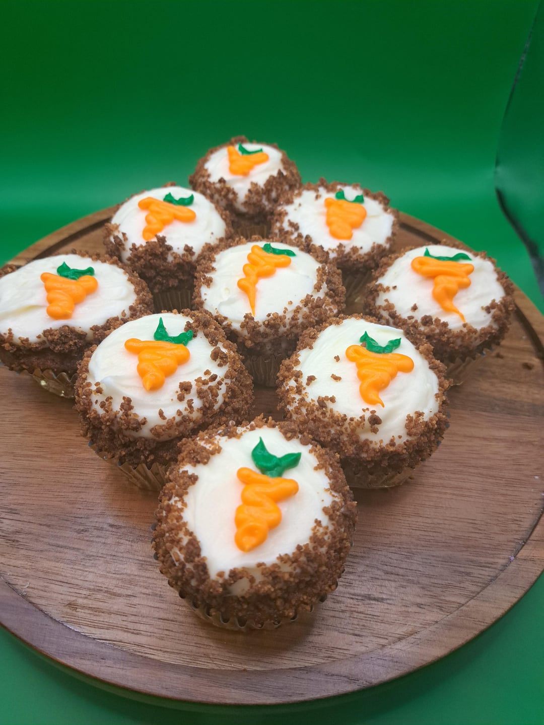 -Carrot cupcakes with a toasted walnut edge. For some reason, carrots are the markers for a carrot cake.