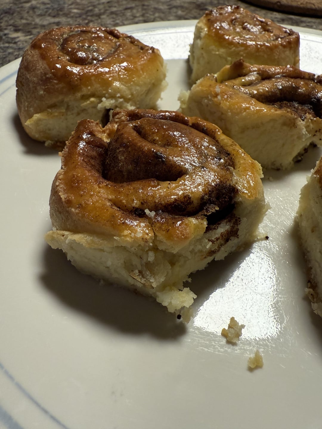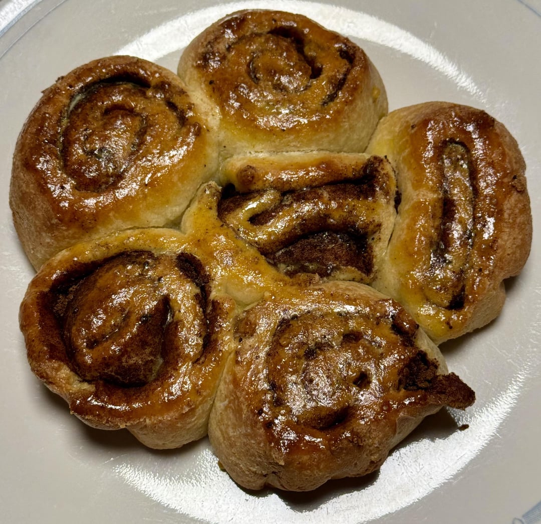 Roll flat, add 1 tsp vanilla with 1 tsp liquid stevia and 1 tsp cinnamon. Brush over dough, roll up and cut into 6 pieces. Place in a baking dish and bake at 350 for 35 mins.