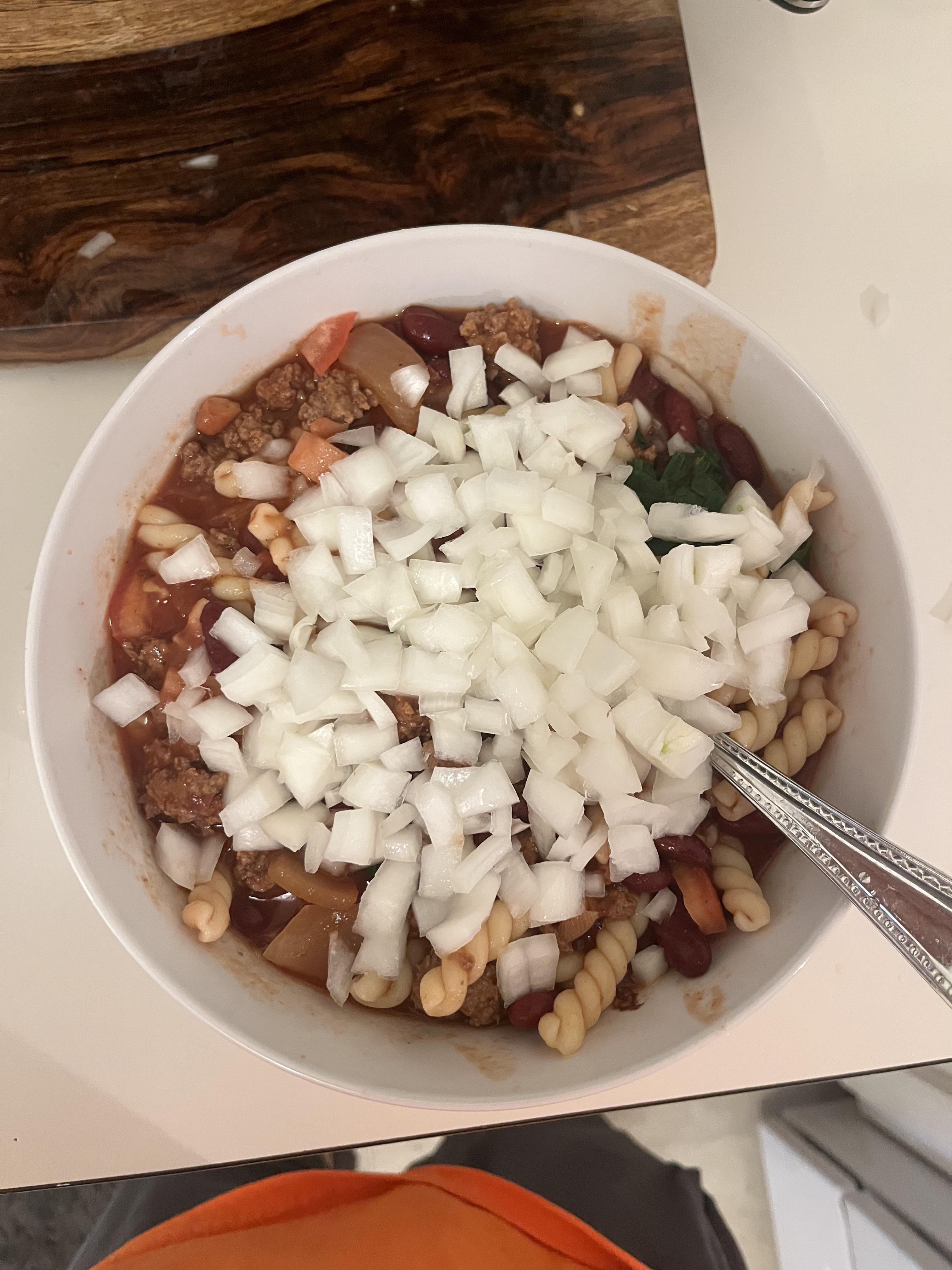 My mom makes a chili that is more like a chili tomato soup, and I usually throw pasta in it to give it more bulk. But this was all the onion we had left after cooking :/ that bowl is 8in in diameter