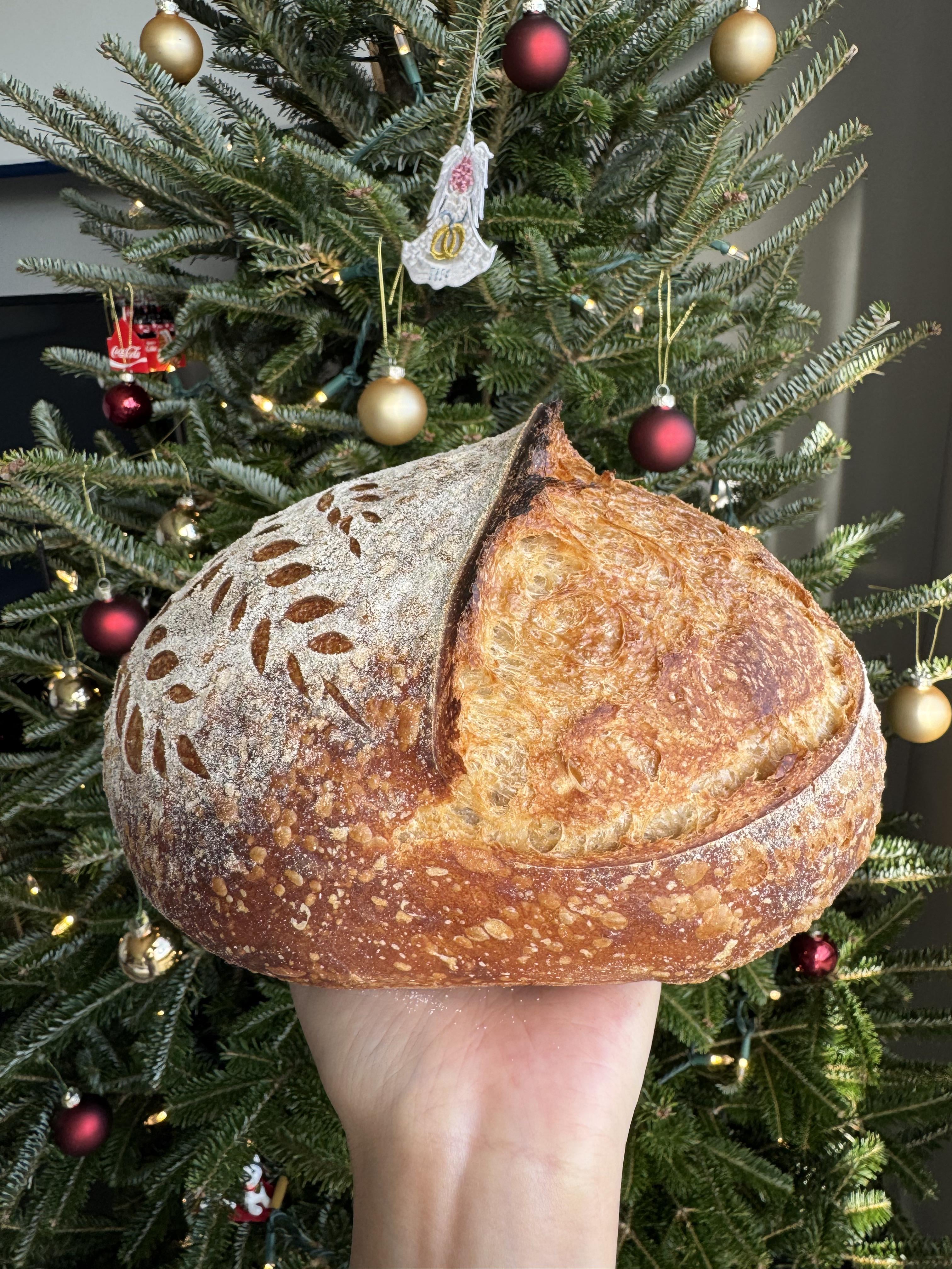 Autolyse for an hour (flour and water) then add starter, salt, and a little water reserve. Stretch and folds 5x on the half hour, coil folds 2x after on the half hour, then continue BF until 75% rise. Preshape, rest 30 mins, shape and cold proof in fridge overnight. Bake at 450 for 24 mins covered, then 24 mins uncovered in DO.