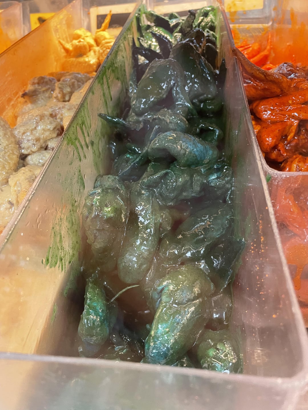 Are they marinating??? If not, absolutely disgusting. Literally just sitting all day in a steamy plastic container smothered in sauce