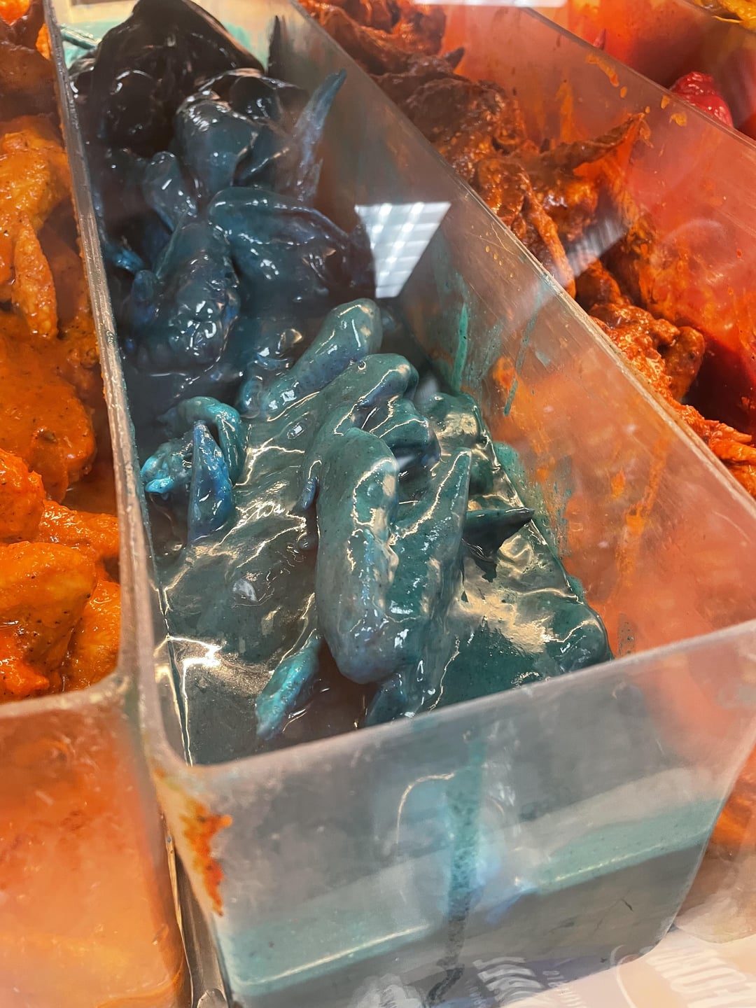 Local meat market has a quite a few premade wing flavors (last pic is probably half of their total wing selection). Would you all eat these? by PanchoVilla6 10 Comments Josephlewis24 10 months ago What universe is this? I wonder if they usually sell out.. Giggz70 10 months ago SMASH! I would totally try them all. Where is this wing nirvana? AustnWins 10 months ago The waste will be substantial. Just… why? Why pre-dress that many wings for the case?Fry up one tenth of that amount and offer the sauce options on the side or tossed after order. Nor-easter 10 months ago I just vomited in my mouth Suddenly_Something 10 months ago I’m more curious why they have they have pools of sauce in their tub the wings are swimming in. They’re either reusing it or it’s a ton of waste. veilofmaya1234 10 months ago Blue might be okay. Zombie would be very cucumber forward which sounds bad on a wing. jdann24 10 months ago Pass. Head_Battle9531 10 months ago Looks like little alien babies, yuck🤢 jlabbs69 10 months ago Sorry, not for me, they look awful FatCatWithAHat1 10 months ago Are they marinating??? If not, absolutely disgusting. Literally just sitting all day in a steamy plastic container smothered in sauceWrite A CommentYou must be logged in to post a comment.