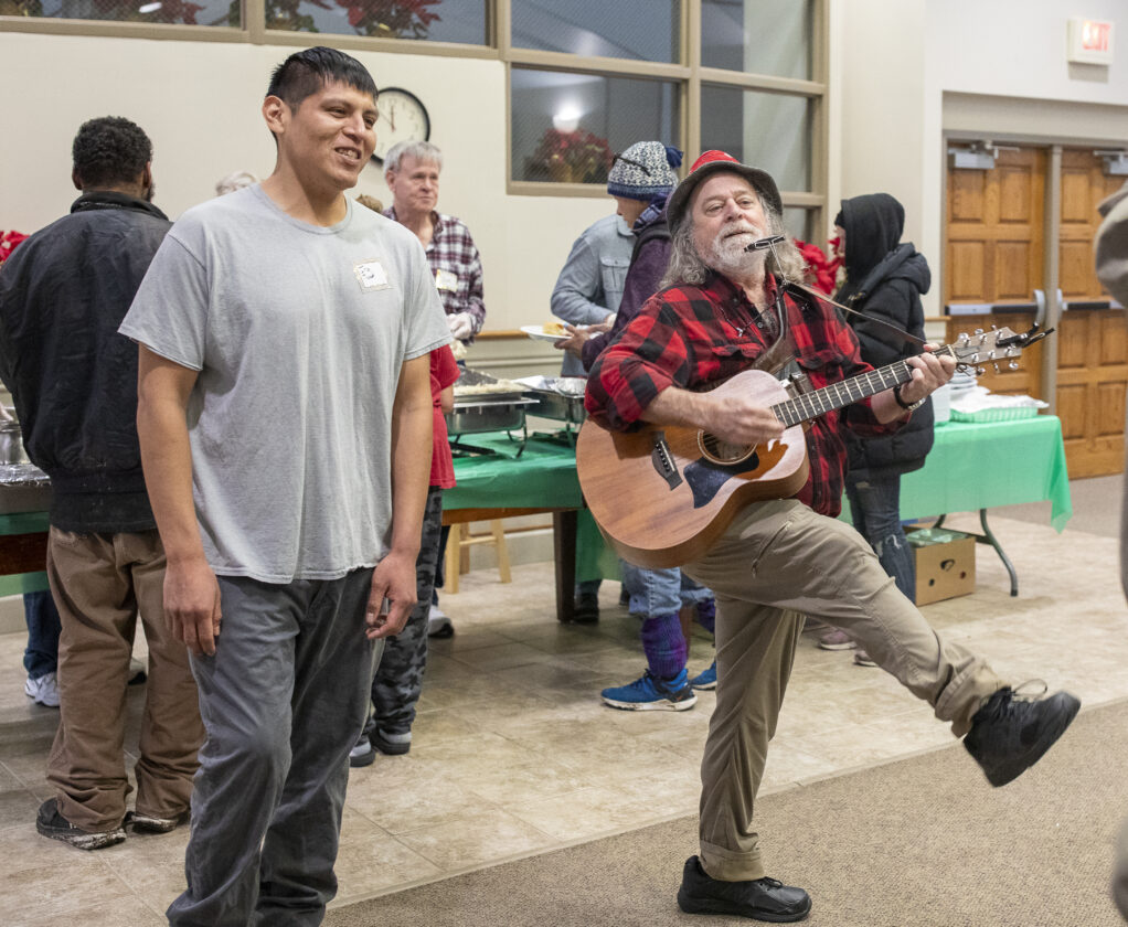 Ira Sifford, left, and Greg Pelligreen entertain diners as they sing the Christmas classic ‘Feliz Navidad’ during the Community Christmas Dinner, Monday, Dec. 25, 2023 at First United Methodist Church, 946 Vermont St.