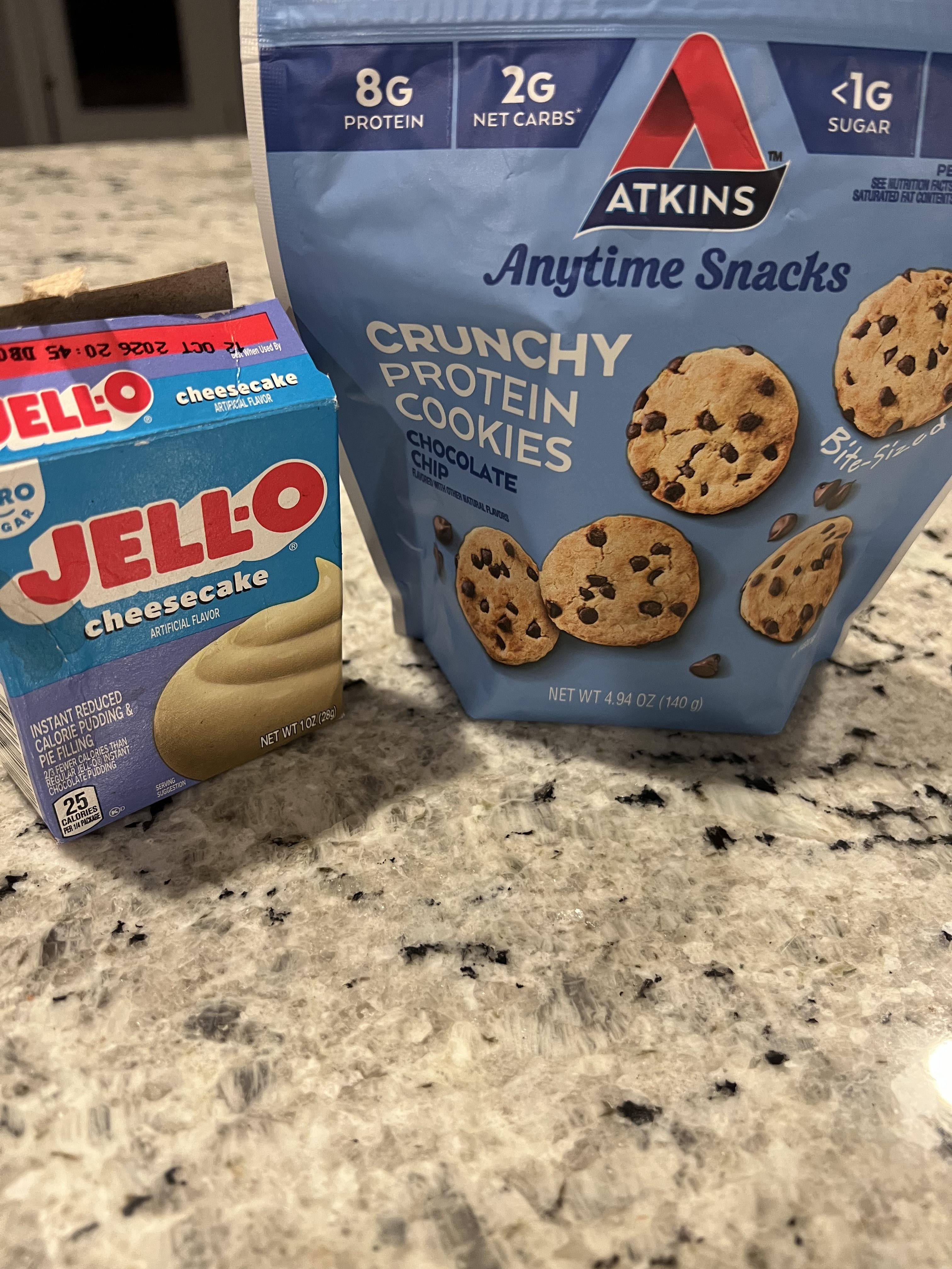 Atkins cookies with sugar free cheesecake pudding (made with half & half or almond milk) is to die for!!