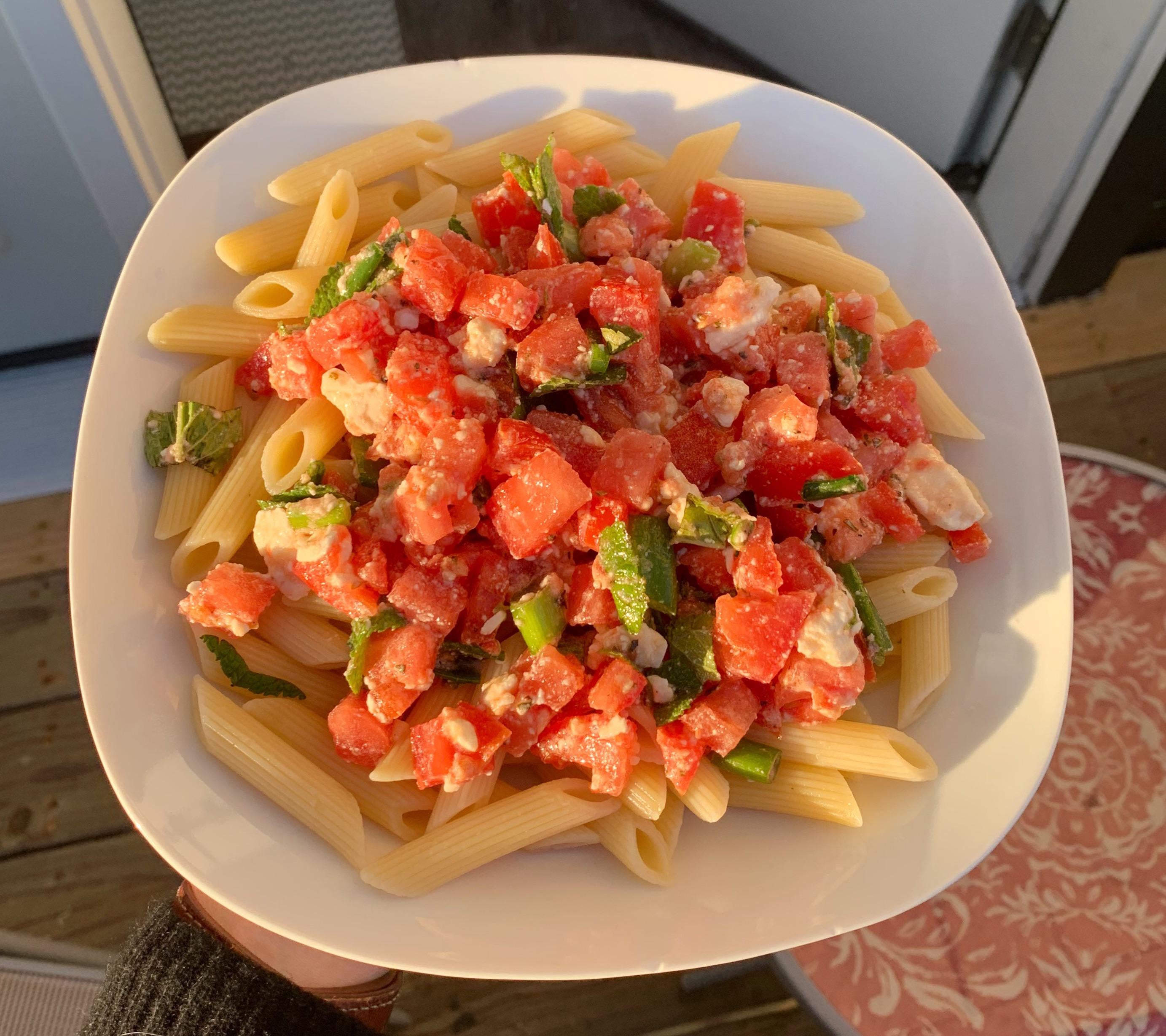 Chopped tomato on the vine (the elite tomato IMO), feta, artichoke, green onion, mint, fresh garlic, olive oil, salt, pepper, crushed red pepper flakes.