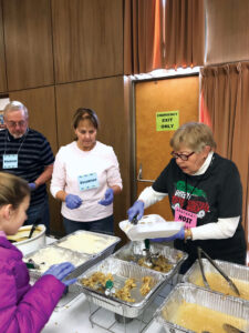Volunteers serve dinner during the 2018 Christmas Day Dinner at First Presbyterian Church in Parkersburg. This year’s event will be from noon-1:30 p.m. Wednesday, Christmas Day. (File Photo)
