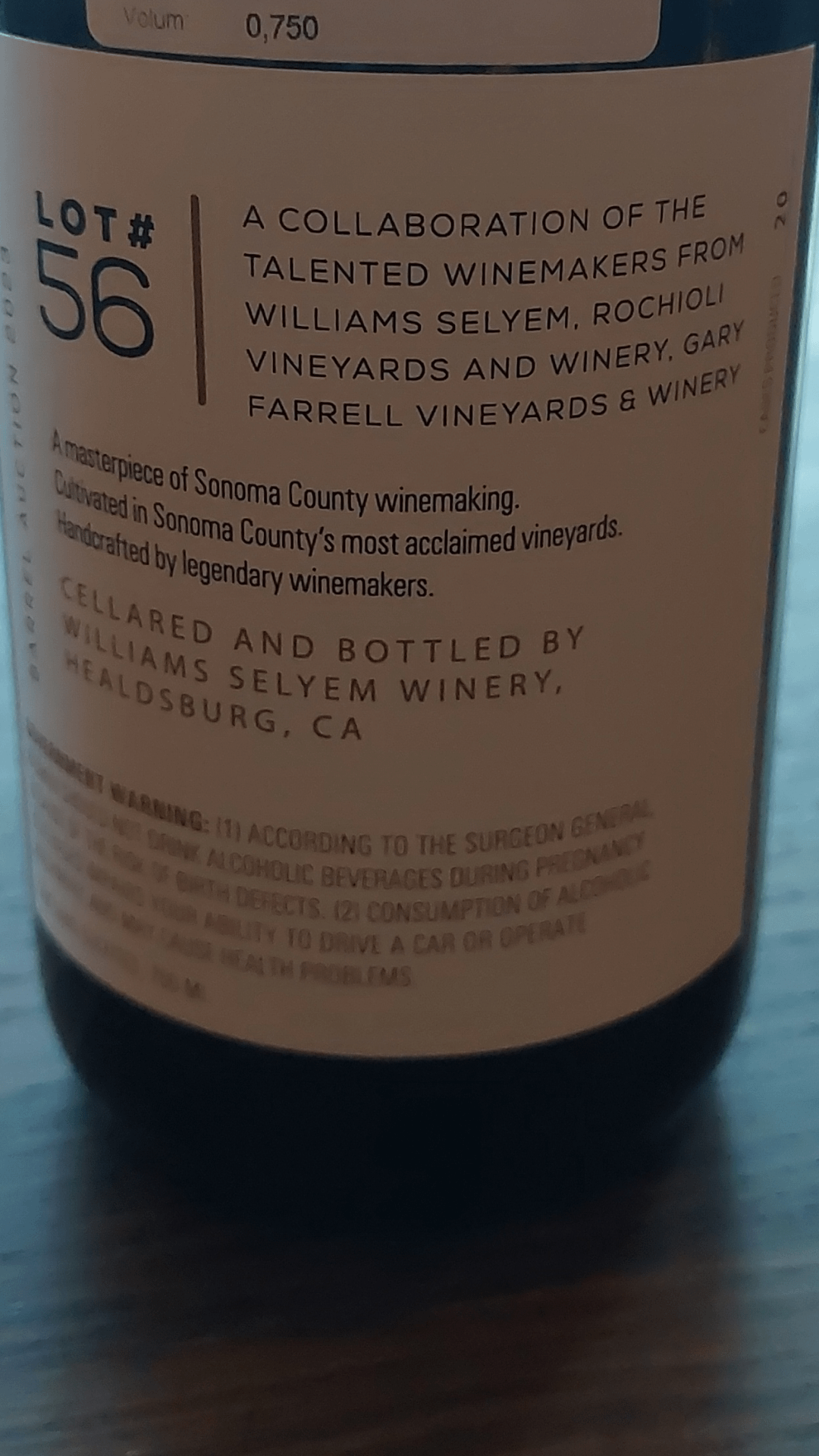 So these were bottled for the Sonoma county barrel auction. It is a Russian River Pinot noir from an exceptional vineyard out on the W. Side Rd., and it’s manufactured by the neighbor of Joe Rochioli, Williams Selyem. It’s a juicy high-end pinot that would retail for ~$60