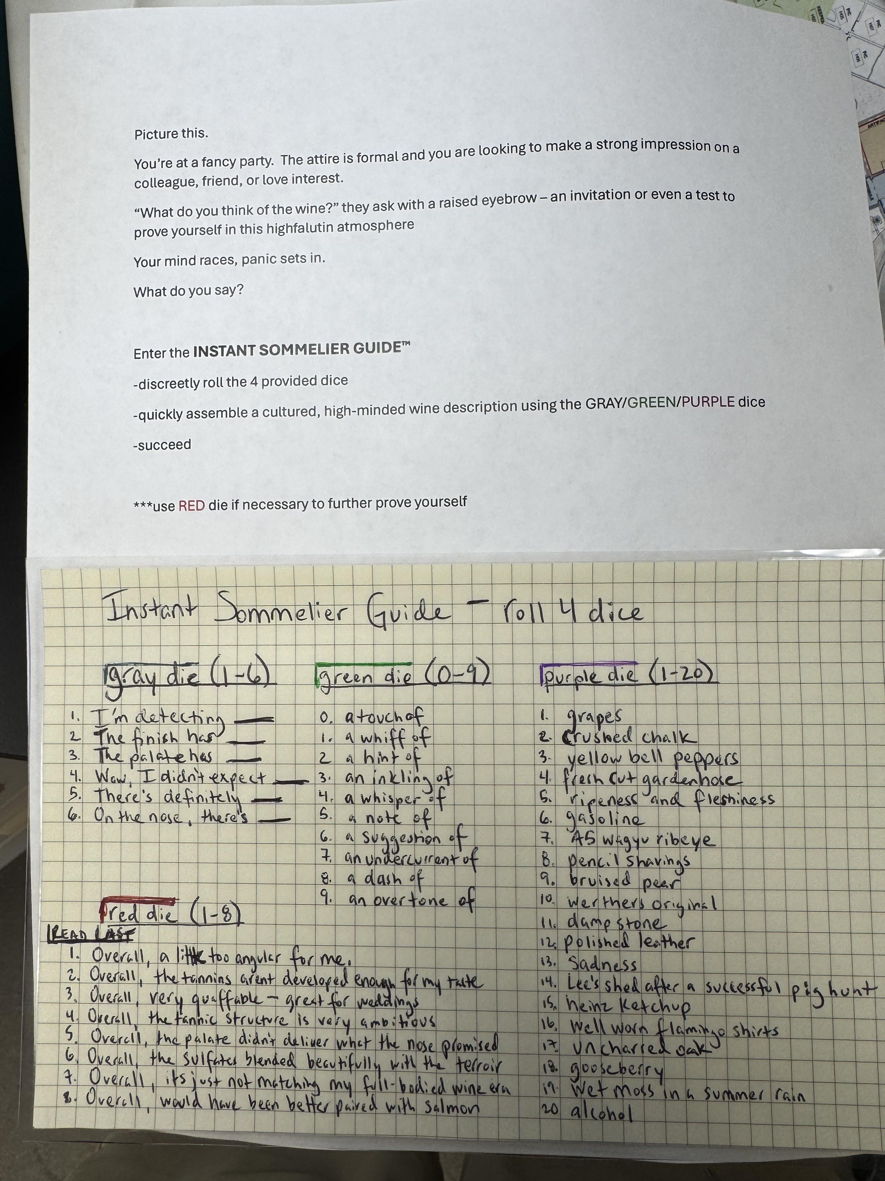 Made this as a joke for a friend. Combined my love of dnd dice and goofy wine descriptions. Let me know what you think.by recycle13 4 Comments SexuallyConfusdNinja 10 months ago You forgot bing cherry! bone1205 10 months ago This is hilarious, well done!! MyPalFoot_Foot 10 months ago Green die #10: a soupcon of thinkismella_rat 10 months ago I’m interested to know more about both Lee’s shed and the shirts.Write A CommentYou must be logged in to post a comment.