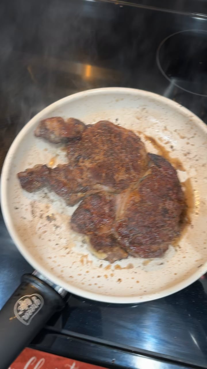 Good job at the interview. If you get the job, go buy a cast iron and never cook a steak on non stick again. It is a great looking steak though, but when you took that heat to medium high to get that crust from that terrible pan you released the coating as non stick should never go above medium heat (IMO it should never be used in general) but above medium heat you release toxins from the coatings… so stop doing that.