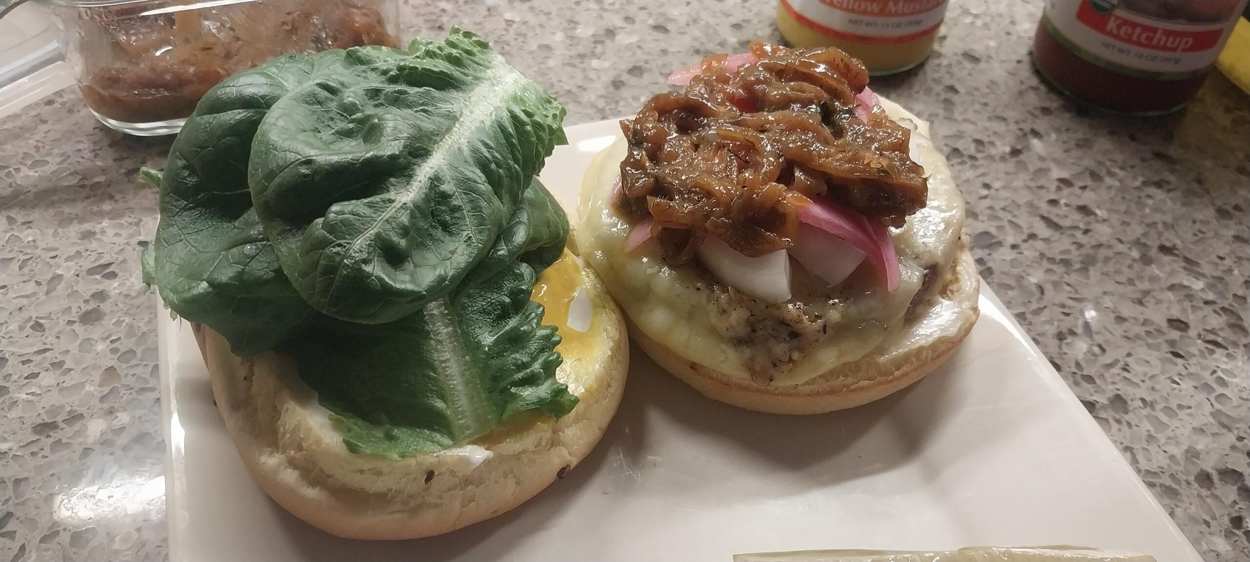 Burger w/ raw sweet onion, pickled red onion, caramelized yellow onion, & 2 year old cheddar on a toasted onion bun
