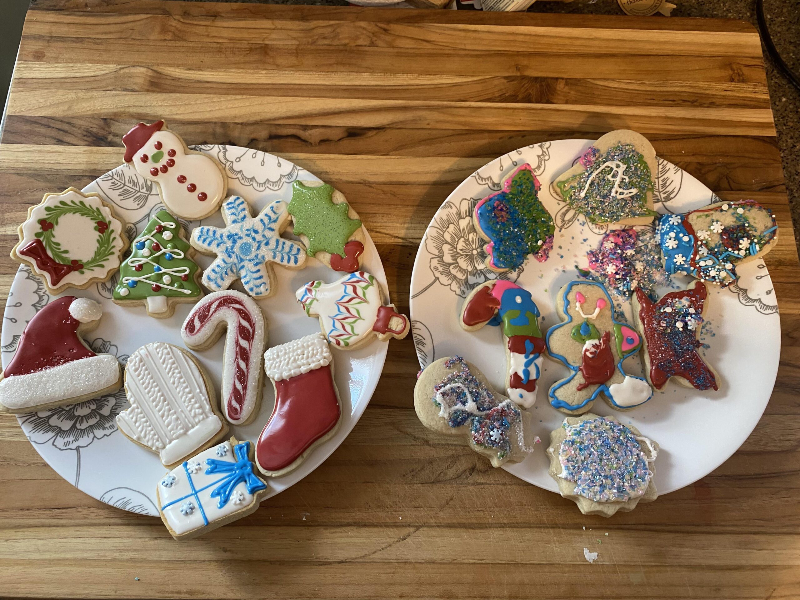 I’ve made way nicer sets before, but I did the best I could while also trying to monitor my 5 year old. Not pictured is her attempt to use sprinkles before icing and the entire container of sprinkles she dumped onto a single cookie 😂 Her gingerbread man isn’t half bad though.