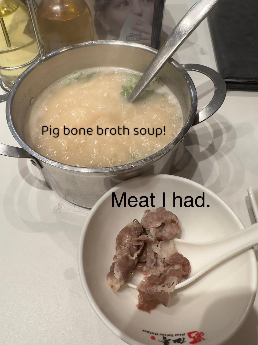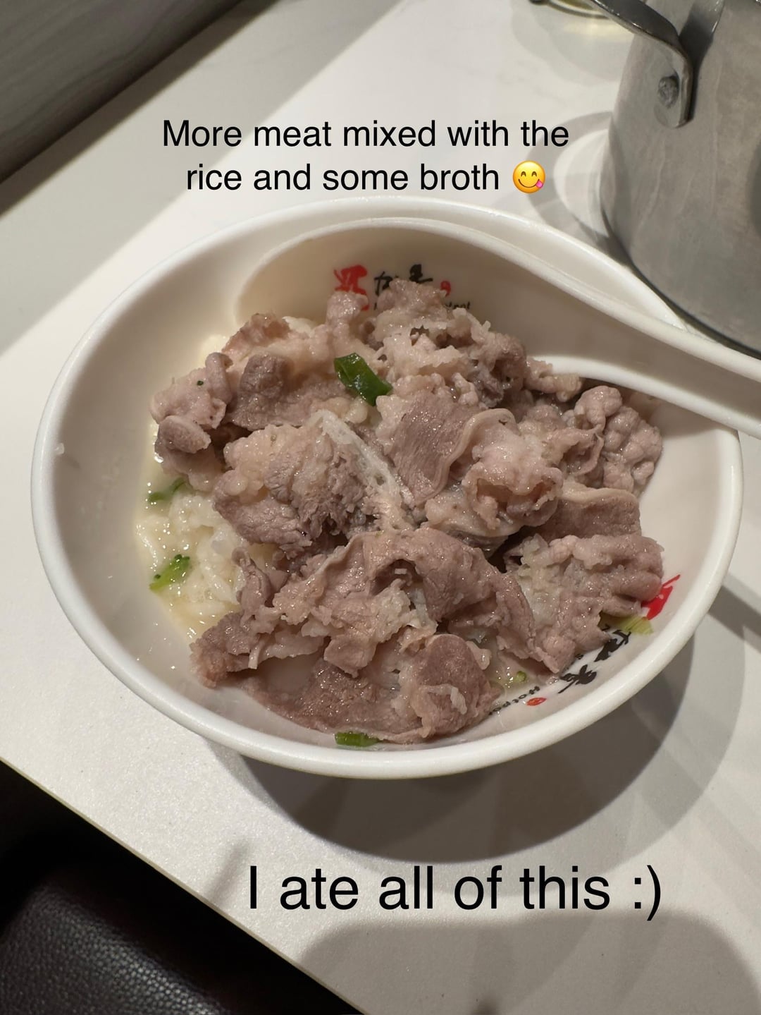 Picture 4. Some beef I had before adding the rice. The broth is pig bone and I didn’t really drink any of it. I just cook my meats and broccoli in it for flavor then take them out and eat it separately.