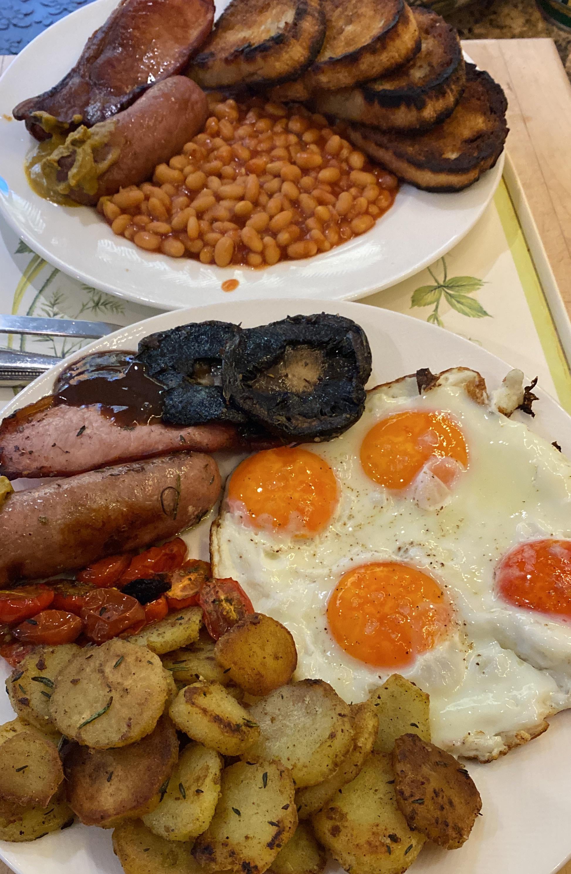 Not my best one from a pictorial sense but it was super tasty. 2 breakfast sausages (pork, seasoning), 4 rashers of thick smoked bacon, 4 eggs, 4 pieces of fried bread, 2 field mushrooms, roasted tomatoes in balsamic vinegar, sautéed potatoes