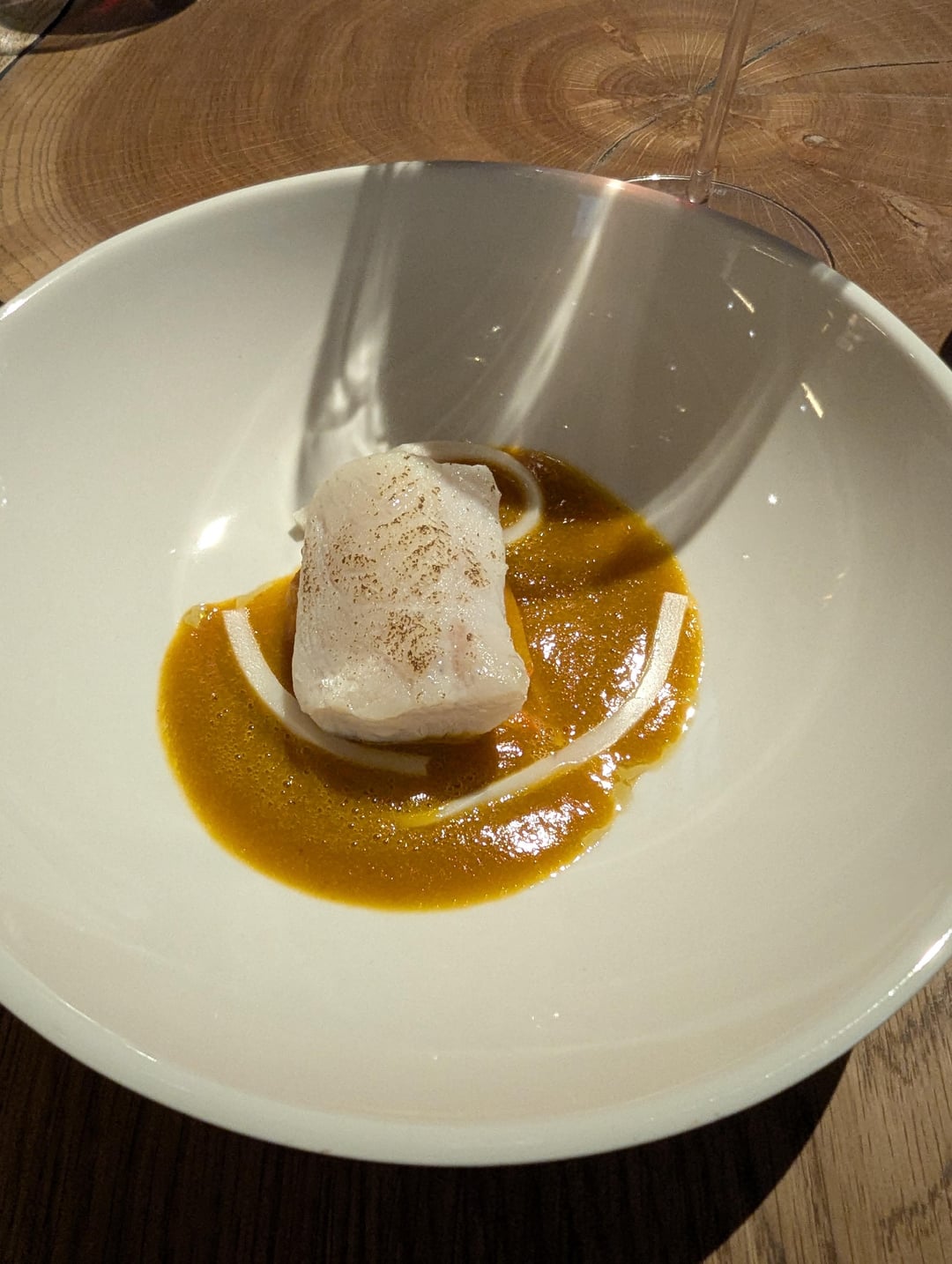 I liked the fish with a thin bit of toast on top to replace the skin, but my husband was less keen. My husband was more keen on the big piece of fish in a pumpkin puree type thing, however I wasn't really a fan of this.