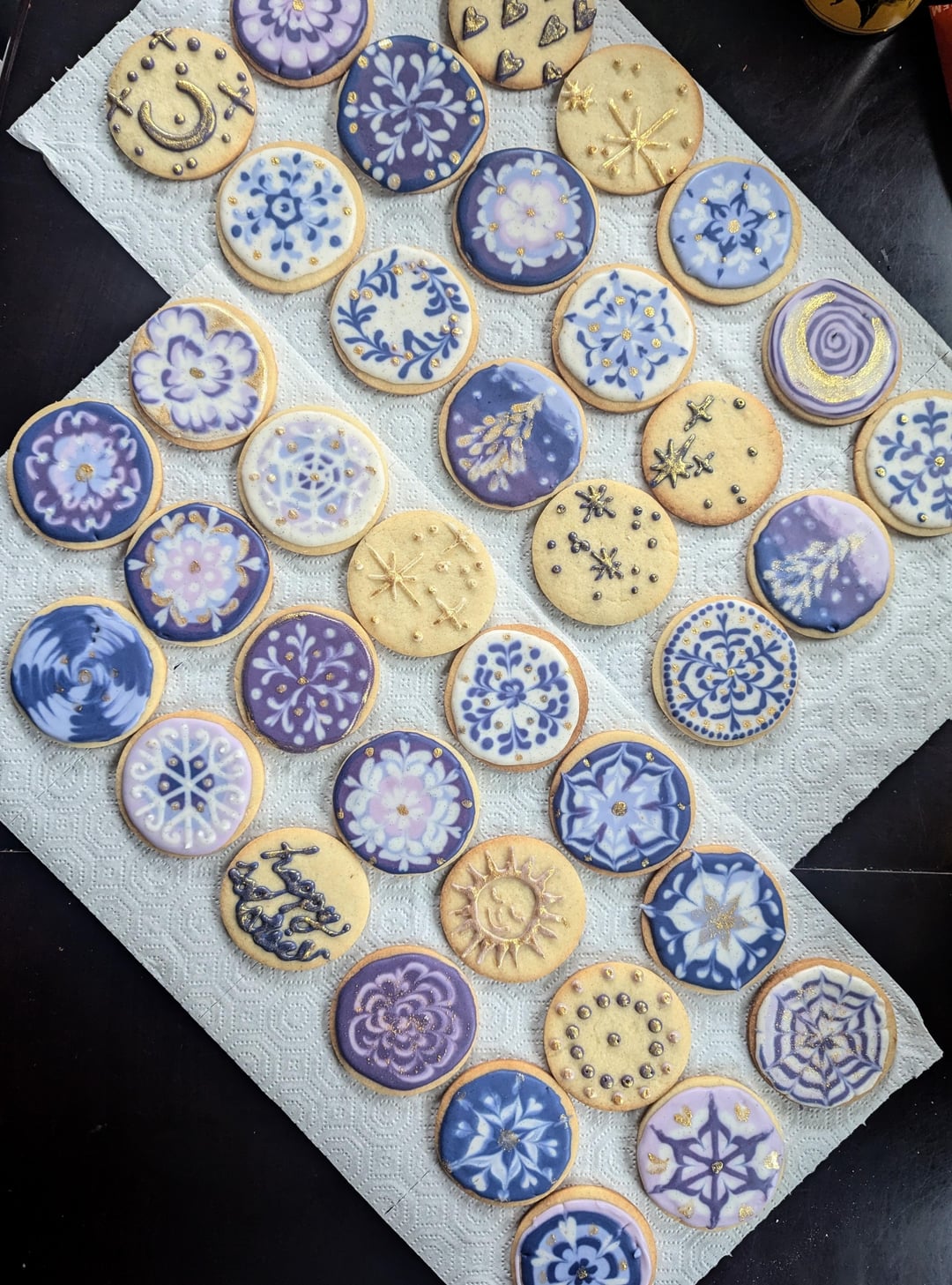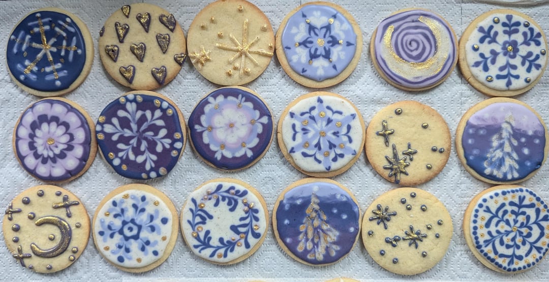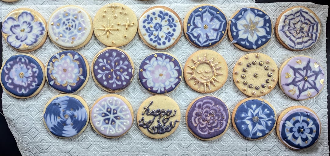 This year I wanted to try a more natural approach so I colored my Winter Solstice cookies with butterfly pea flower powder! I'm super happy with the results (of the colors- icing consistency could still be improved)