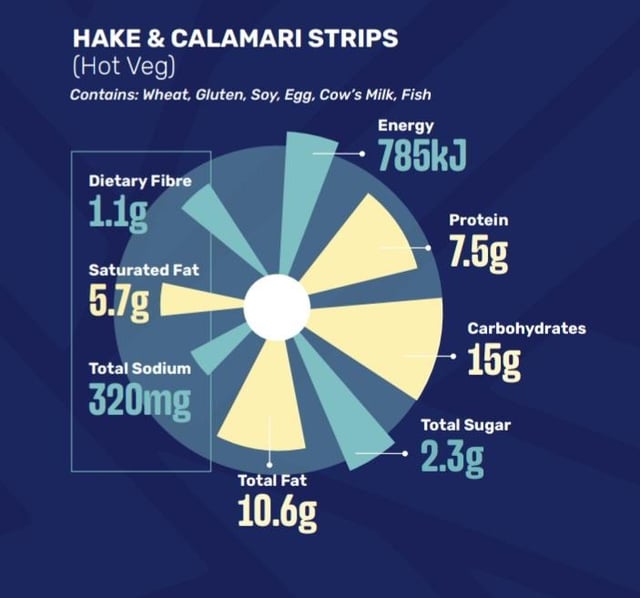 The nutritional guide is only per 100g. The menu item includes hake, calamari and a side of hot veg. Would 600-700 calories be a good estimate for the whole thing?