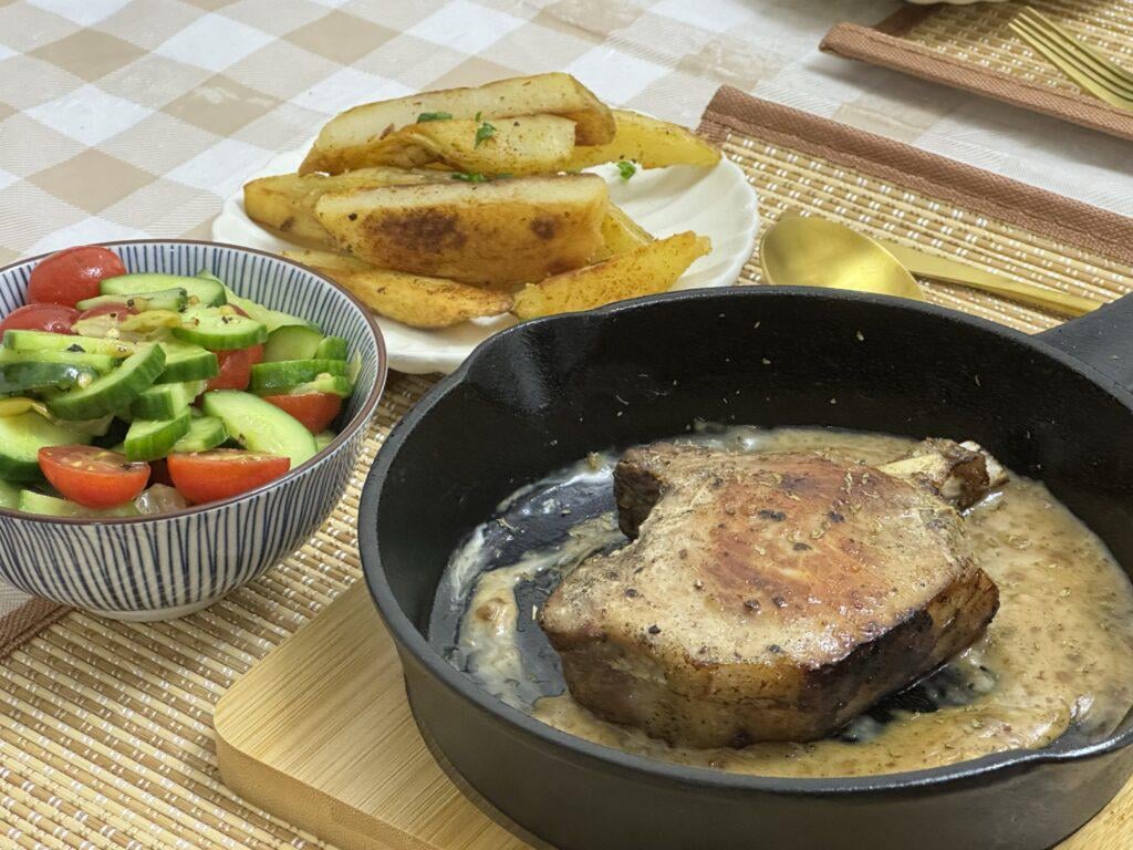 Decadent date night duck fat fries need a lean protein to balance things out. Sous vide pork chops come out perfectly juicy every time. Serve with a simple salad to complete the picture.