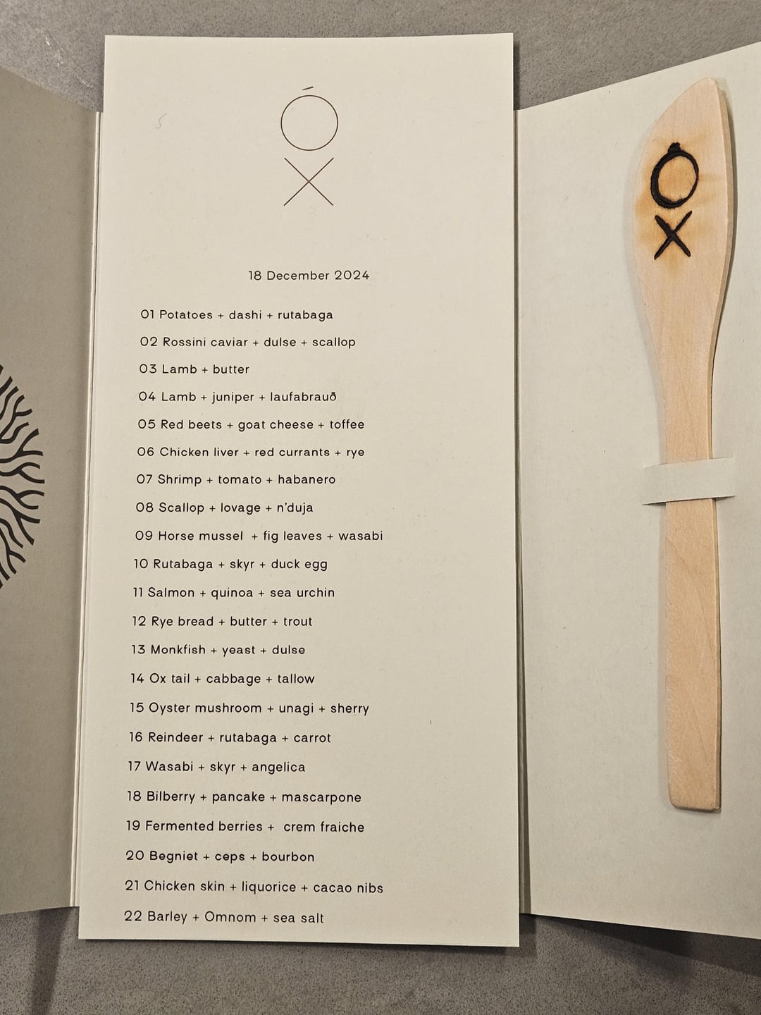 My wife and I were in Reykjavik last week and were fortunate enough to visit ÓX. This happened to be our first Michelin starred restaurant and we were absolutely blown away. The restaurant itself is meant to look like the chef's grandmother's house with the first few courses and cocktails served in what appears to be a 70's living room before taking us to the dining room which feels like I'm eating at the kitchen table at my own grandparents house. The interior of ÓX is a fantastic homage to the chef's grandparents and led to an unforgettable dining experience. The dishes showcased icelandic ingredients for a focus on modern renditions of icelandic classics (menu at the end), every dish we had was impressive and surpassed our every expectation. If you ever find yourself in Reykjavik, ÓX is well worth the stop.