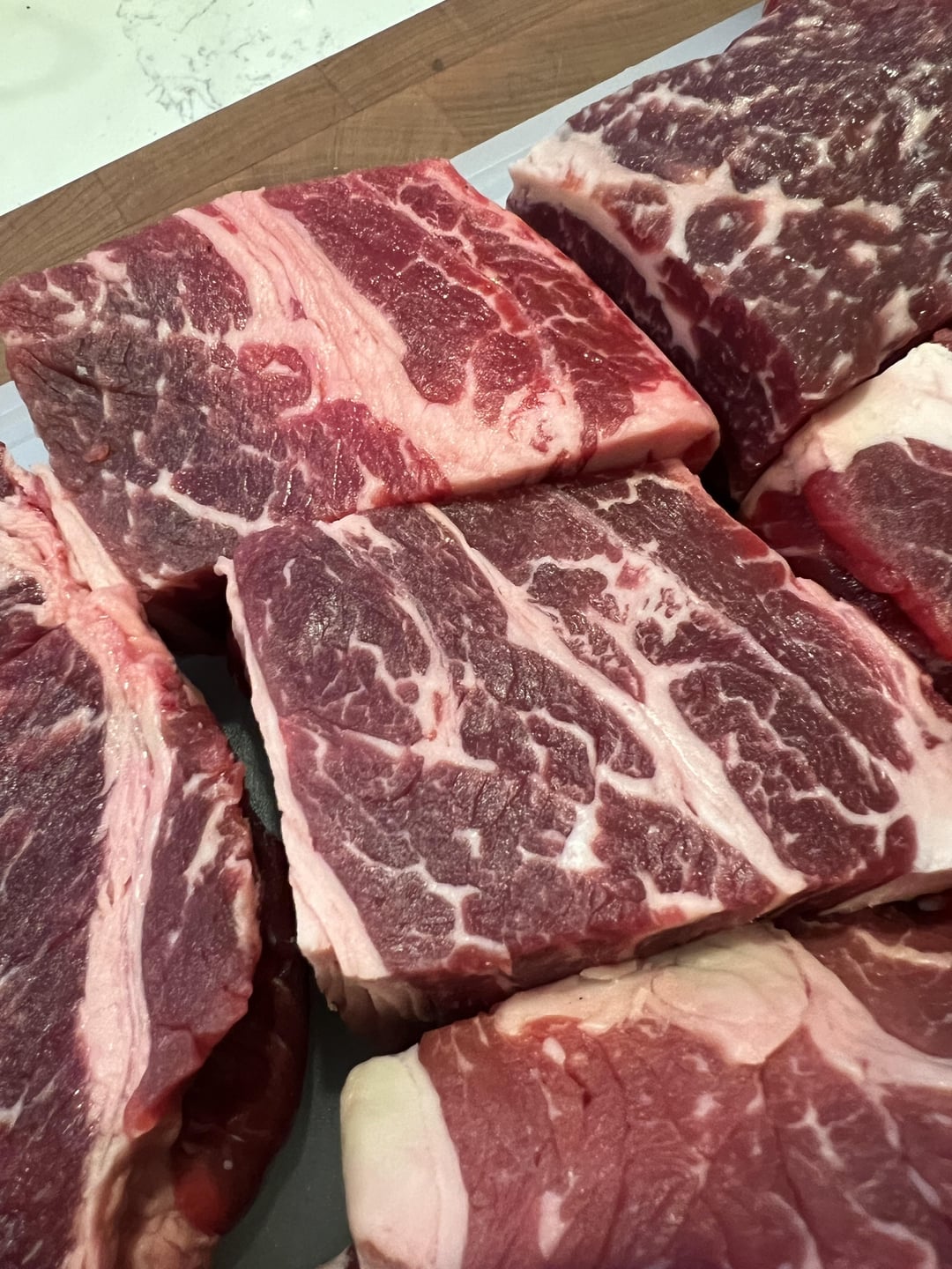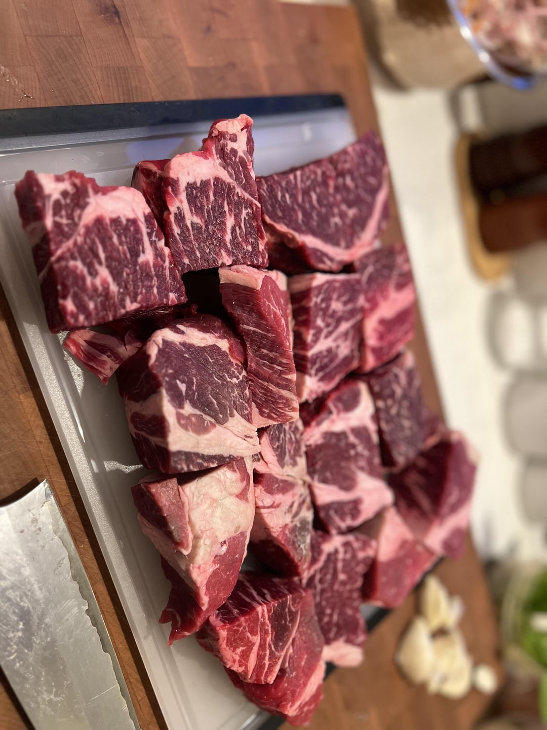 I’ve had great success in the past making Daniel’s red wine breeze, short ribs recipe, but this time around, I just couldn’t find any good looking short rib anywhere near me. They were all very bony with very little meat just struck out everywhere. I checked. So instead, I found the most marbled chuck roast I could and I’m gonna try making the recipe with that. Wish me luck!