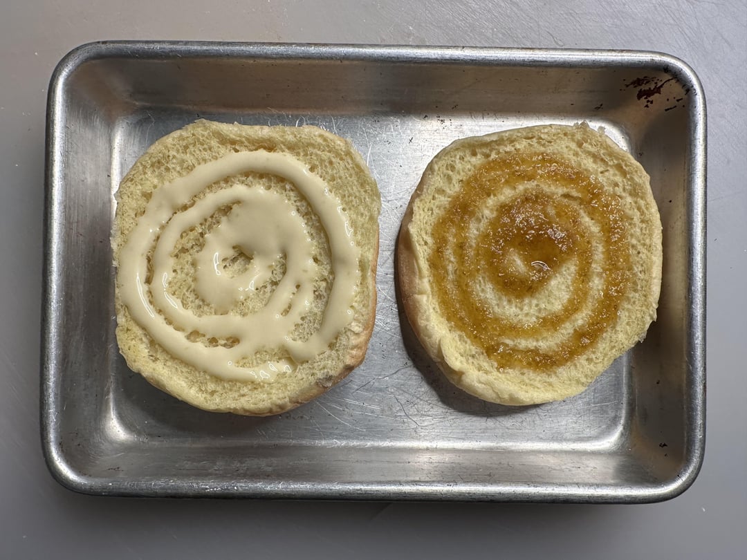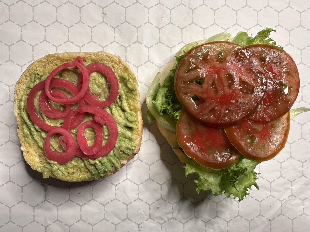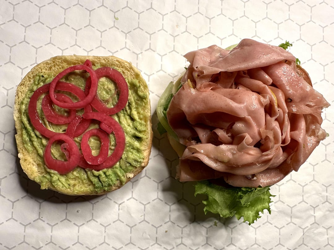 Mortadella, Muenster, lettuce, tomato, smashed avocado, and pickled onions with homemade Maple mustard aioli and maple jalapeño sauces. Roll into the oven foist to warm and melt the cheese.