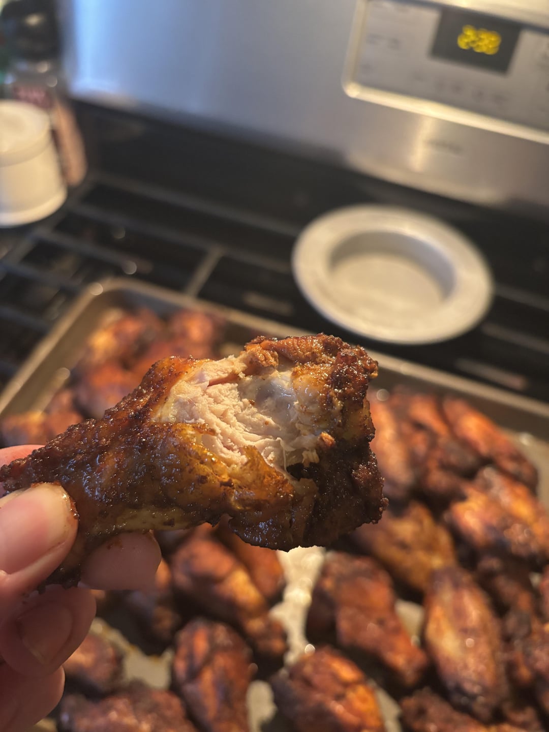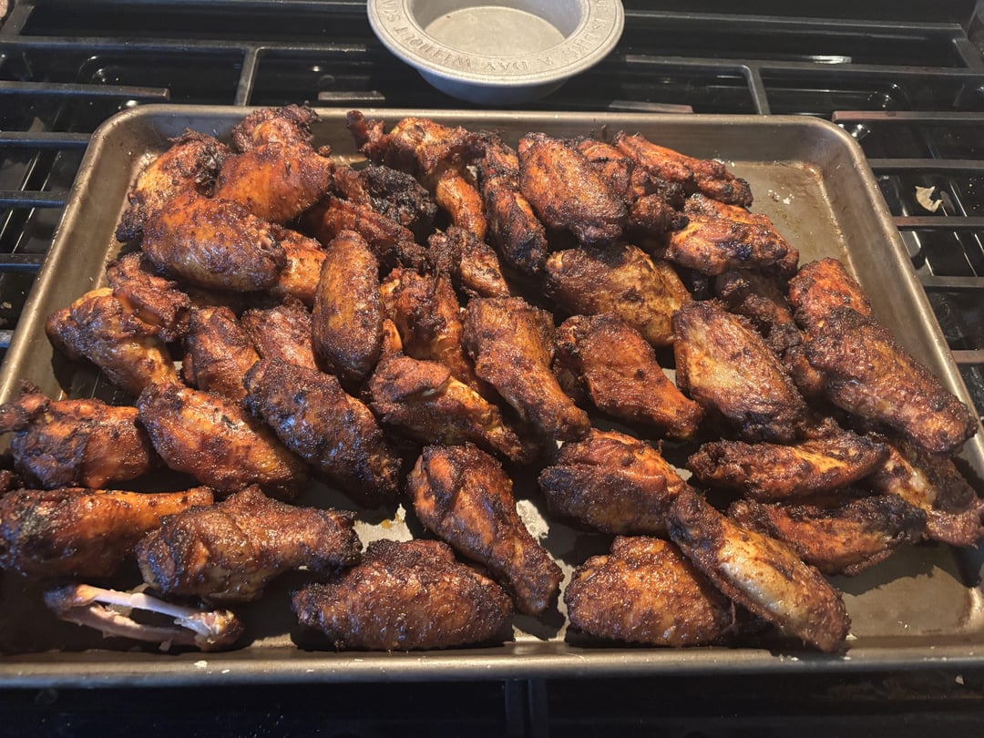Kirkland wings smoked with Kirkland pellets. Wife made these dry rubbed with a mix of onion/garlic/cayenne/chili powder/paprika/siazon goya/msg. No salt directly added to rub mix.