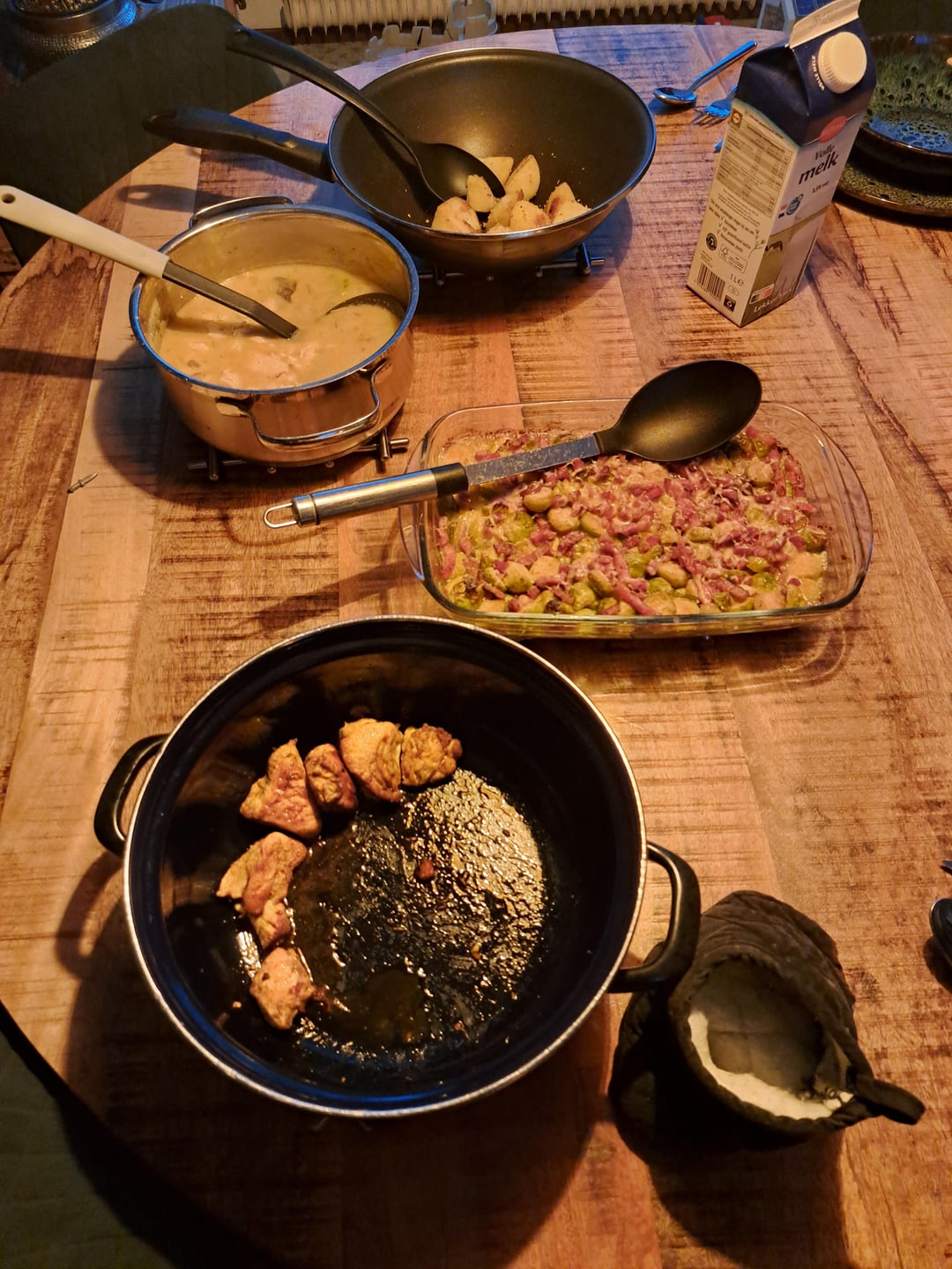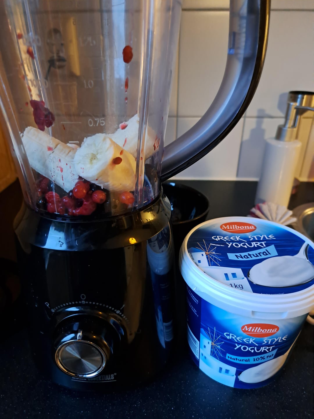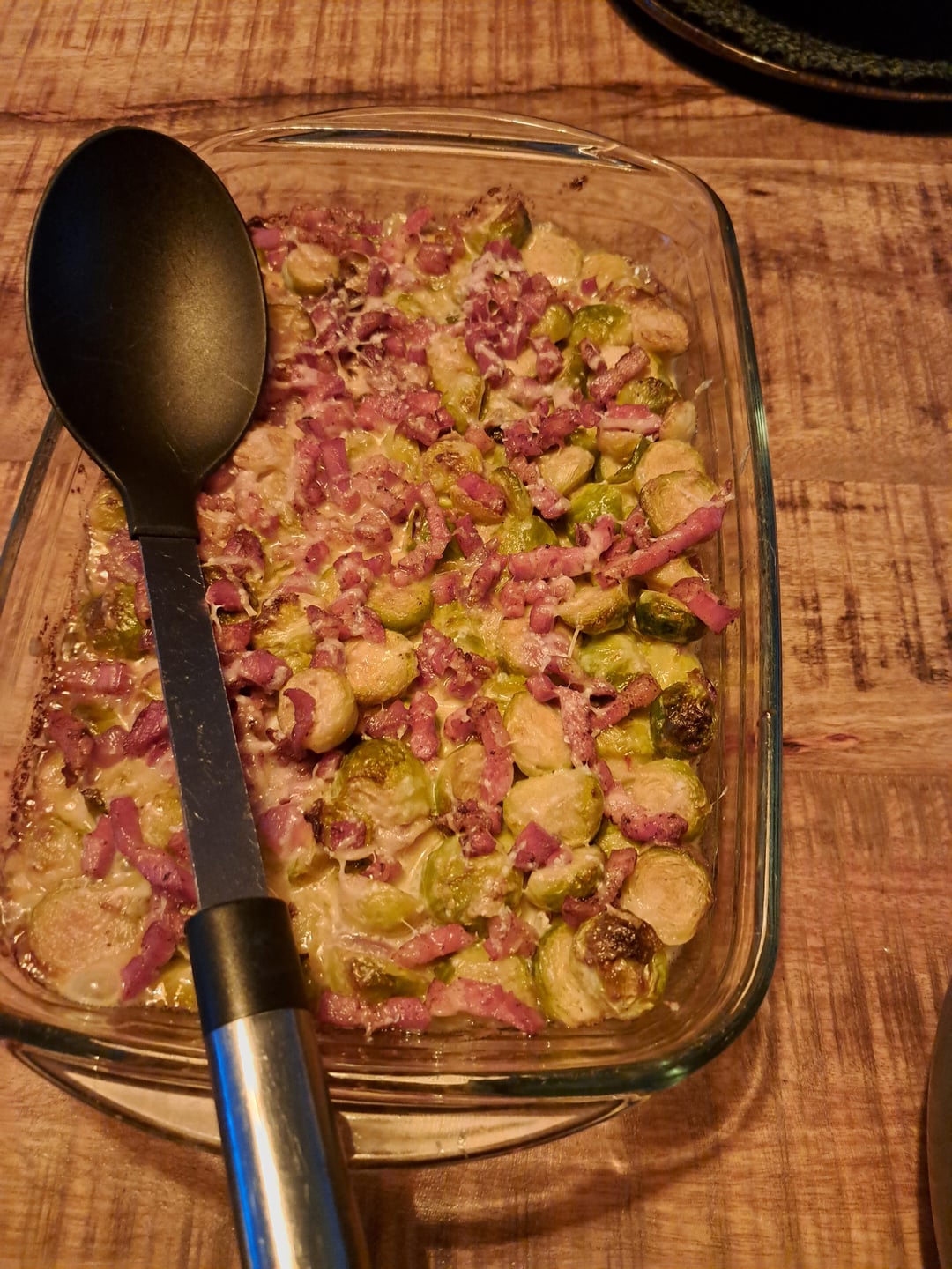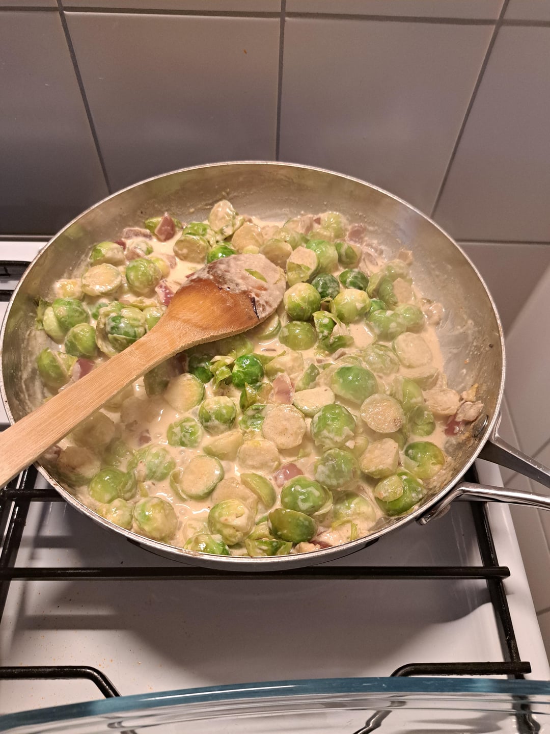 Dinner: lowcarb Brussel Sprouts, Tom kha gai soup, and leftovers: Arabian chicken and baked potatoes. For desert: mixed forest fruit, banana and Greek yoghurt